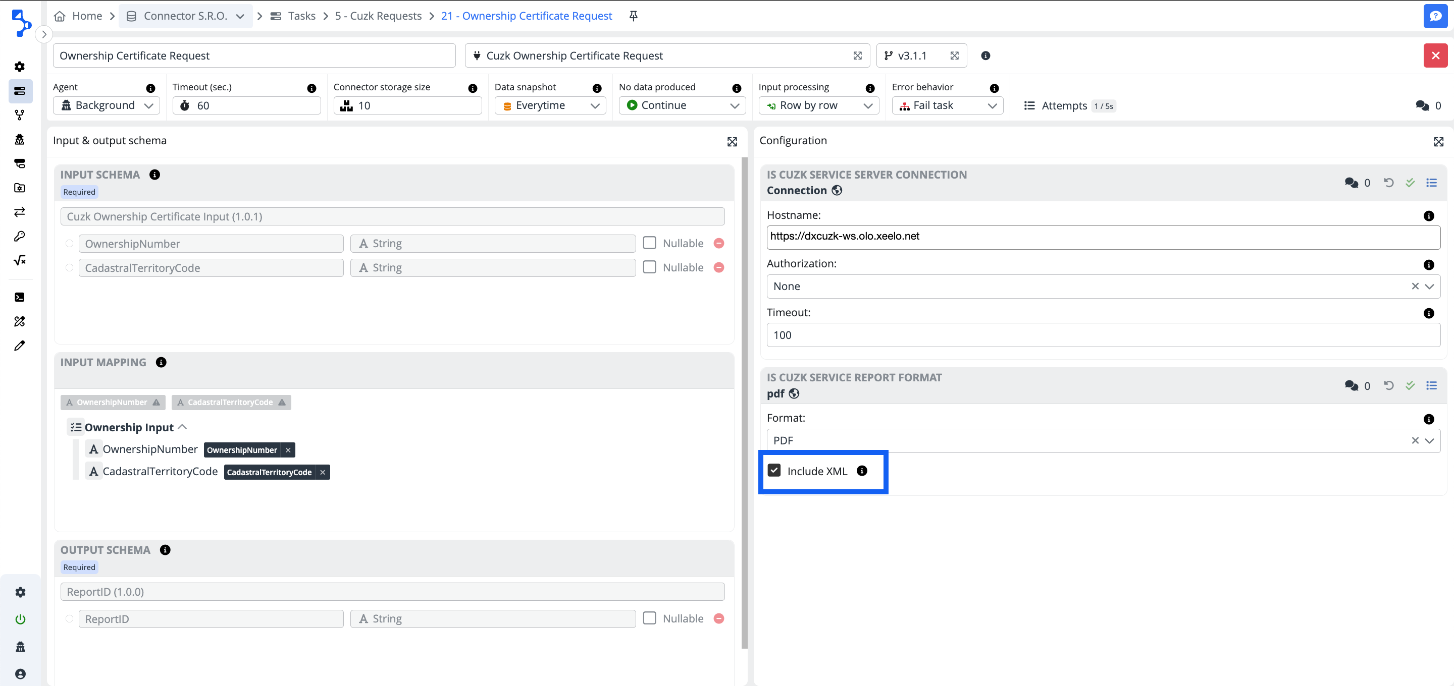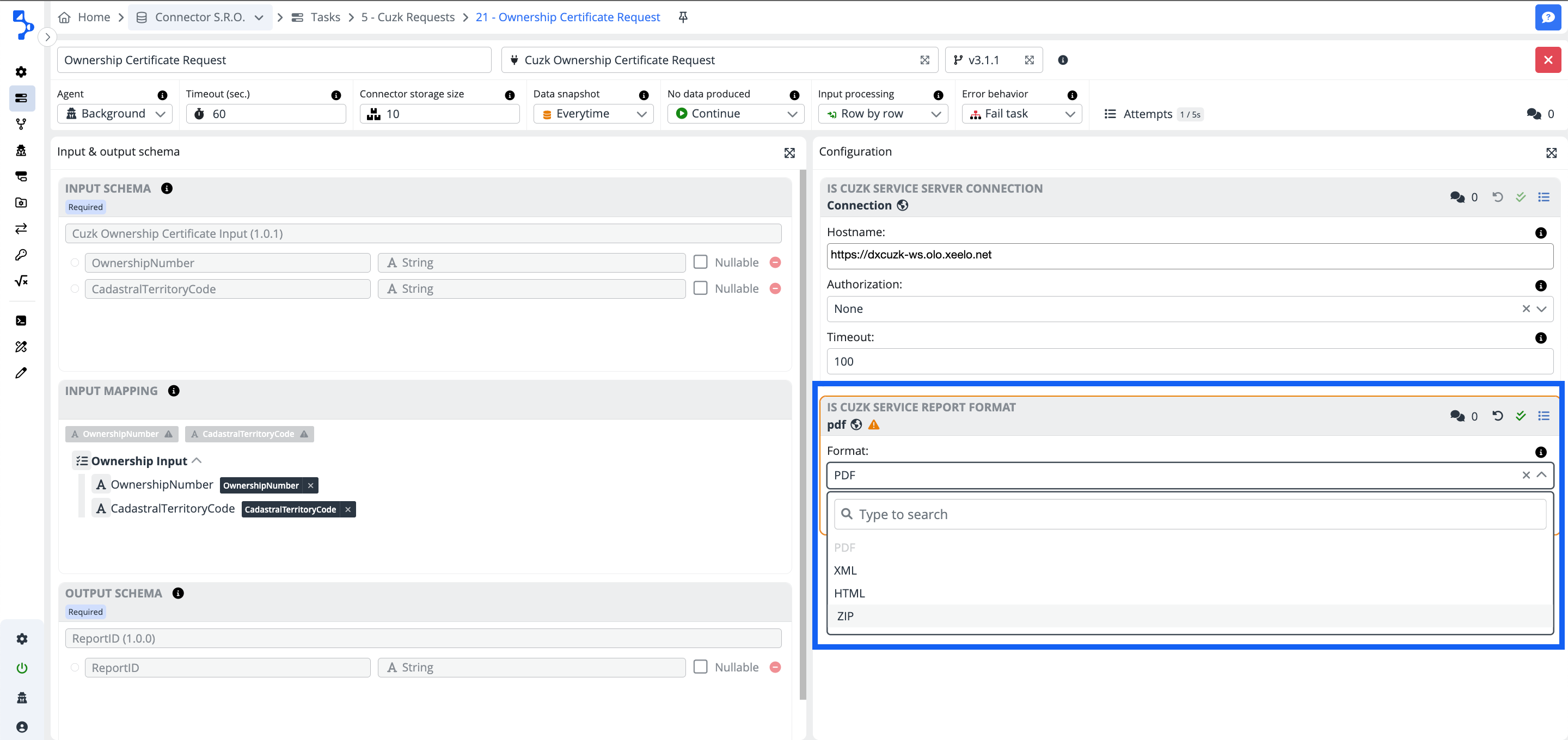 This connector provides for the creation of the ownership certificate (ownership deed) issuance request to the Real estate cadastre. The response to the submitted request is the ReportID which is consequently used in the next step working with the ISCuzk Report reader connector as an input.