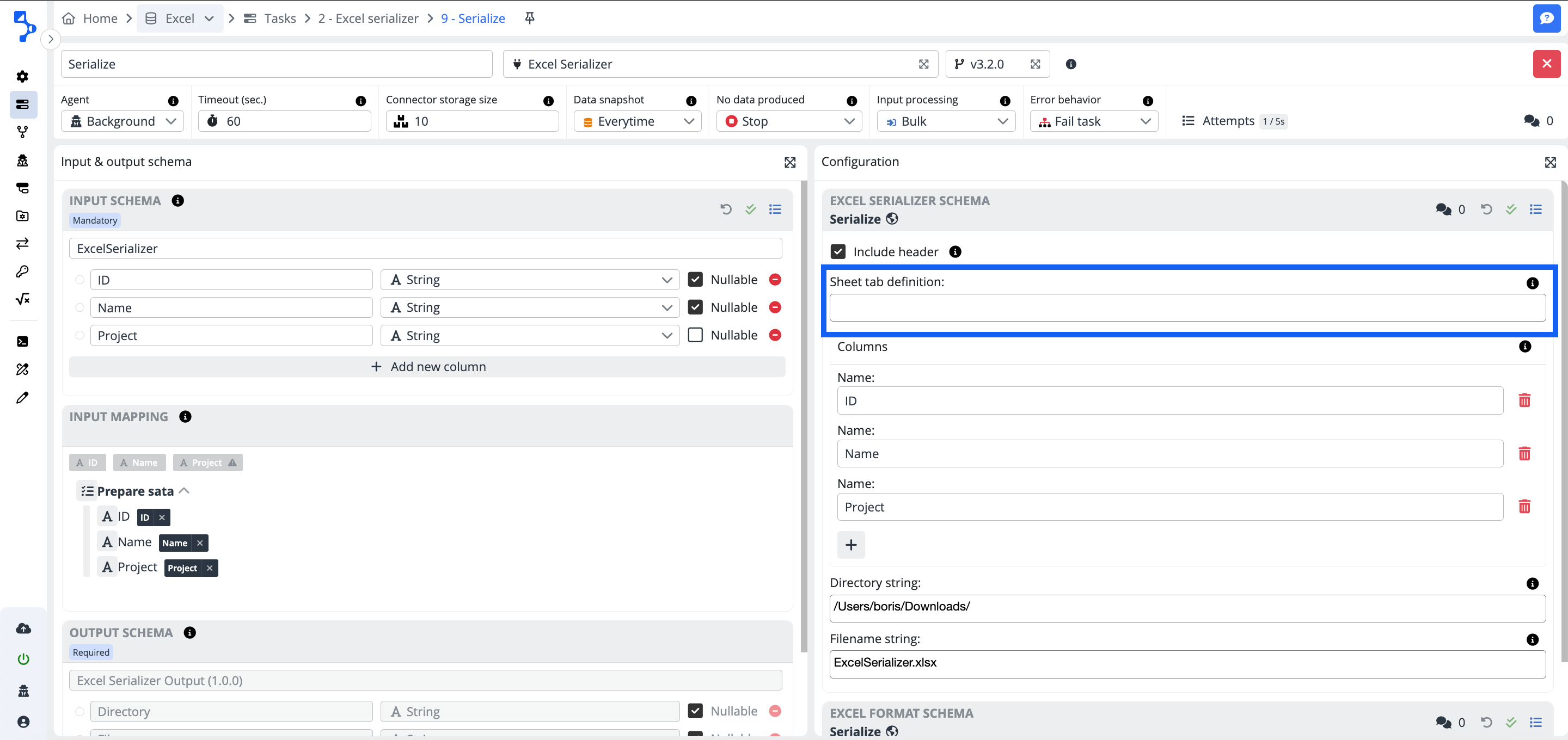 Directory: The name of the directory, where the excel file should be located (in case it would be writen to file after serializing step).