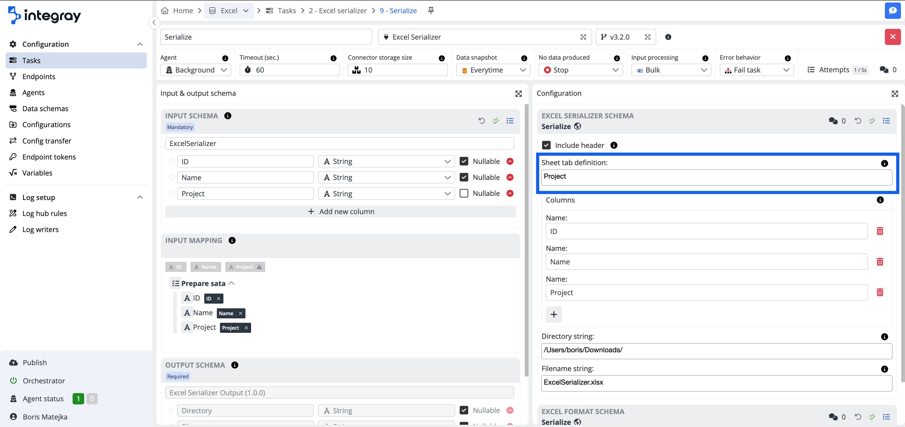 The definition of the created Excel file Filename in the output schema.