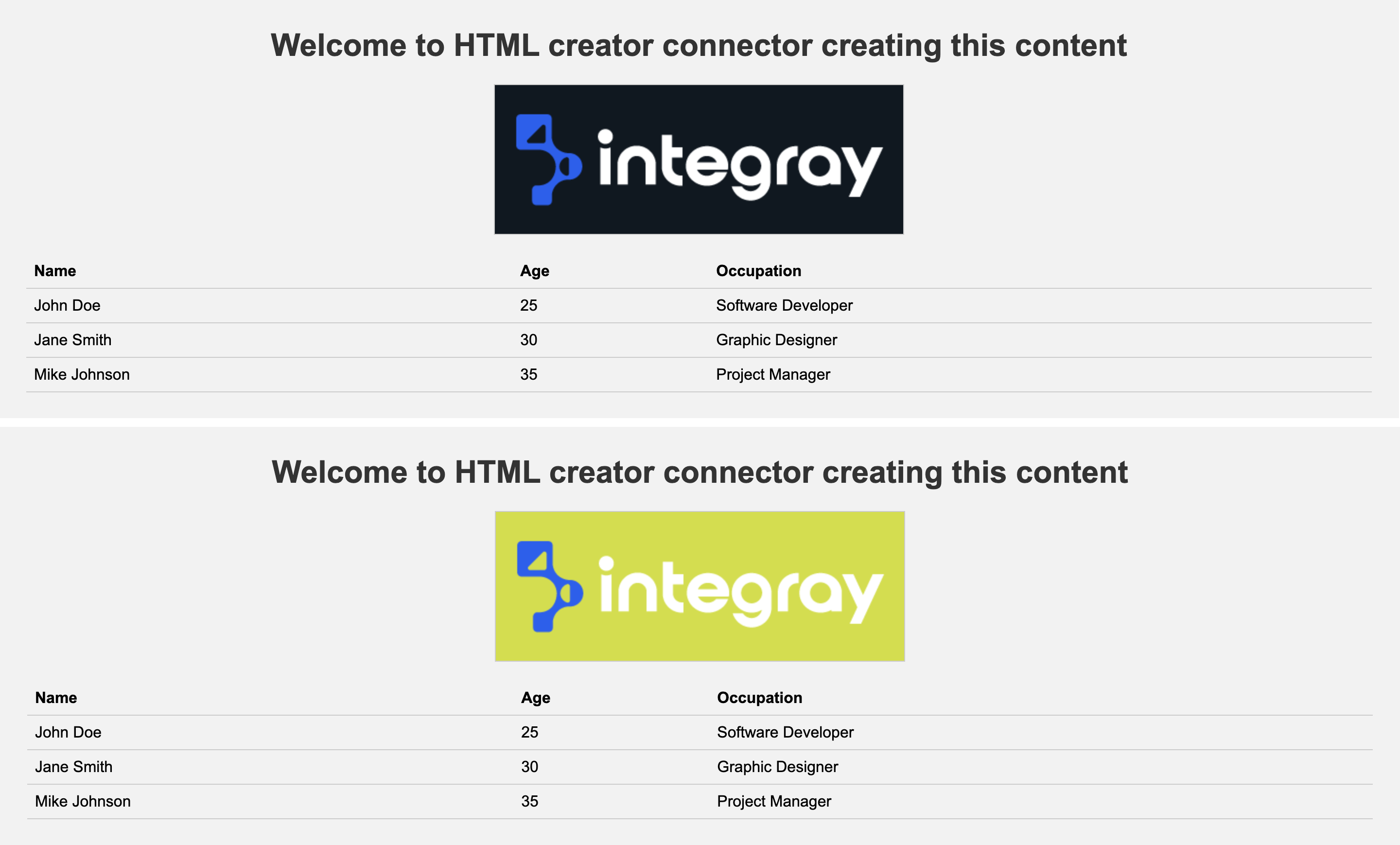 The HTML creator connector allows you to create custom HTML content using HTML code, CSS style, and Java scripts.