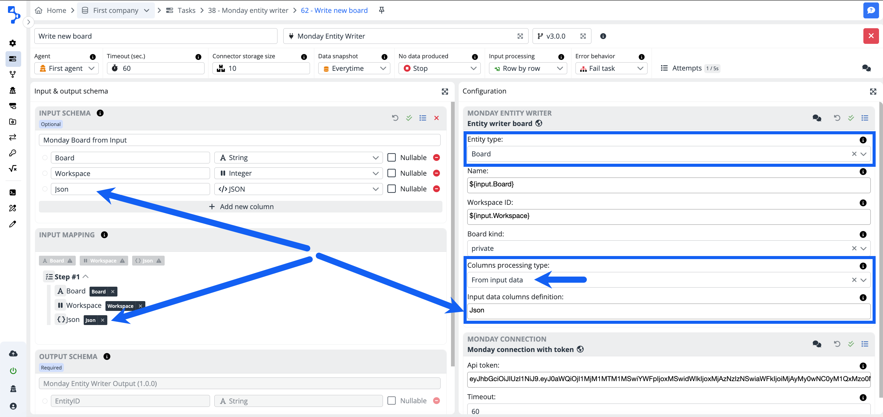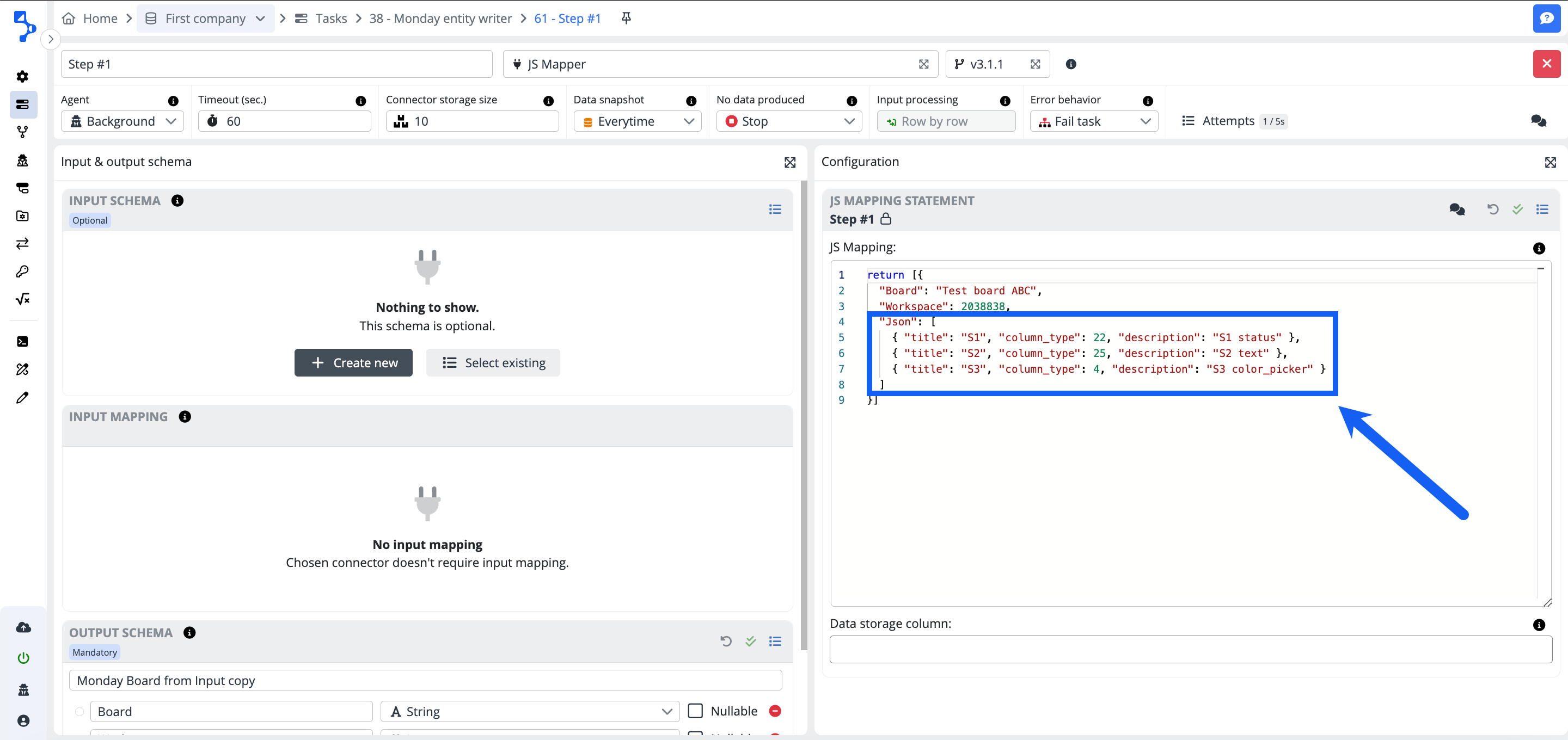 Step 1: Definition of input where board columns are defined using JSON (example connector used: JS mapper)