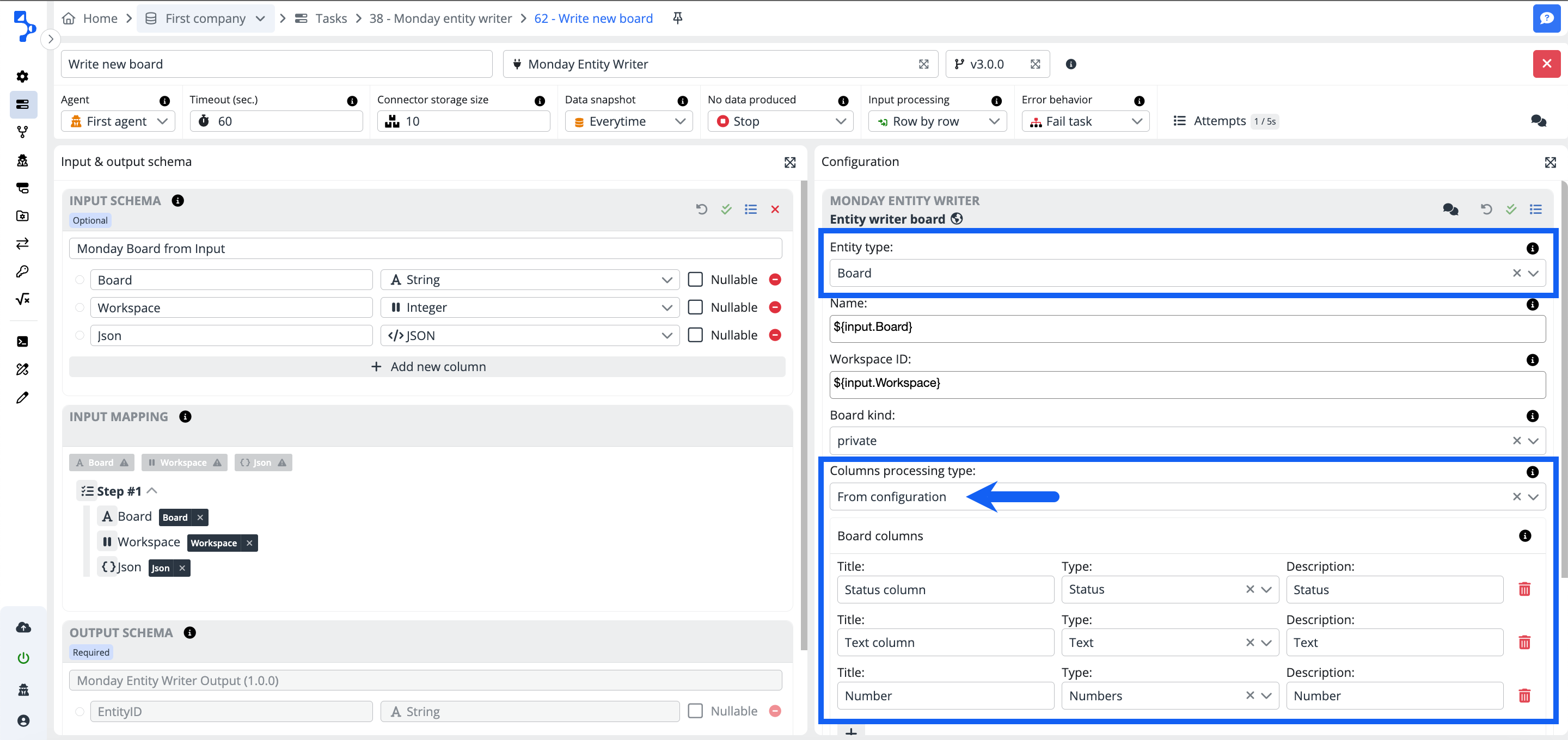 Example of the configuration of the MondayEntityWriter for creating a board including the columns.