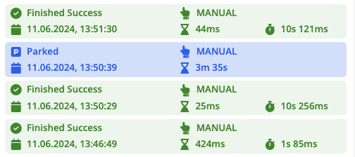 Example: If you set this mode and run the task twice in succession with a Wait time of 10 seconds and Number of retry attempts set to 2, the task will run for 10 seconds in progress. Subsequently, the next run will also be in progress for 10 seconds, and automatically, two additional runs will be initiated, each taking 10 seconds.