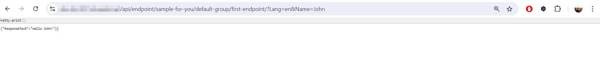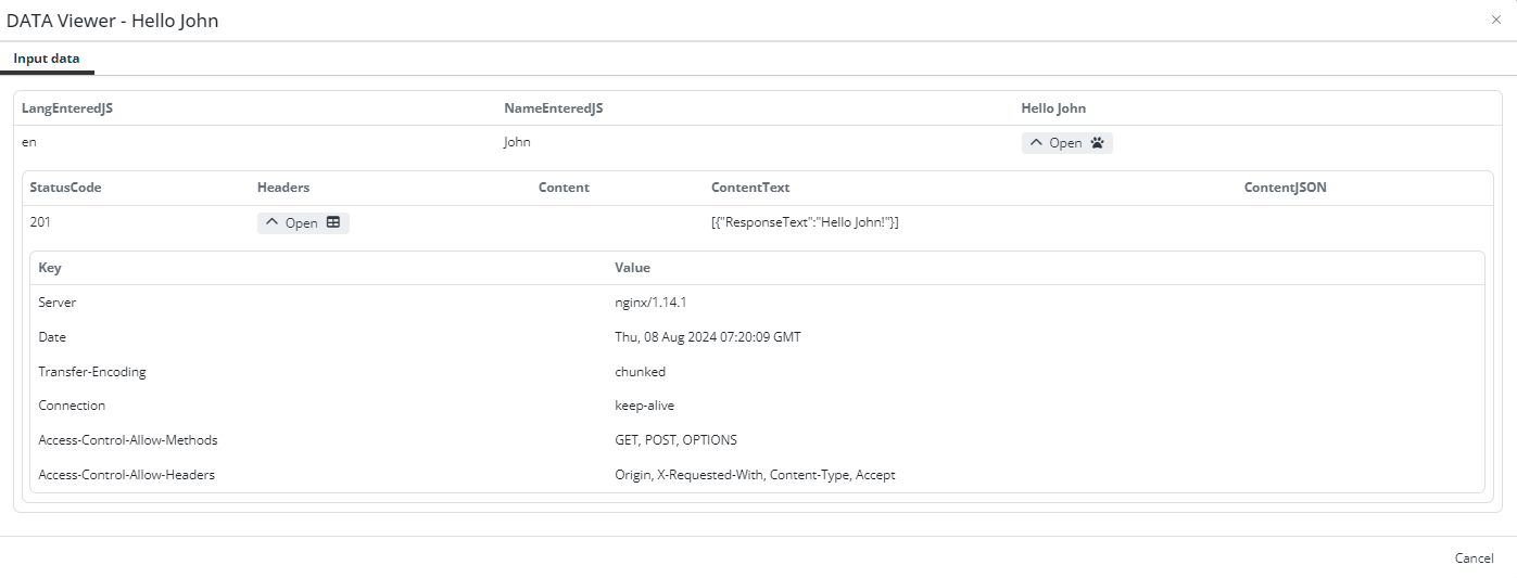 As you may recall, in your first integration, you needed to add Language and Name parameters to your Endpoint URL. The result was a running Task called by the Endpoint and the outcome looked like as follows: