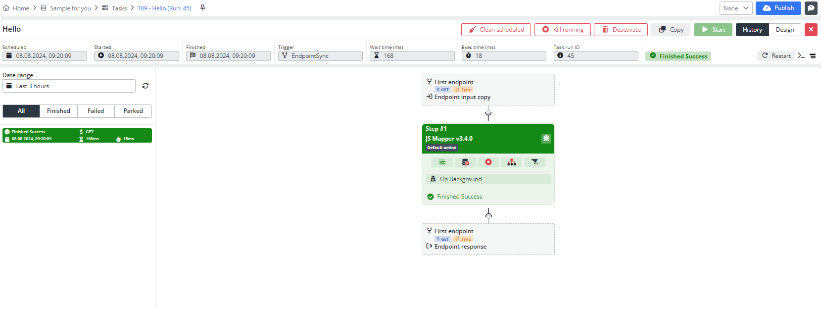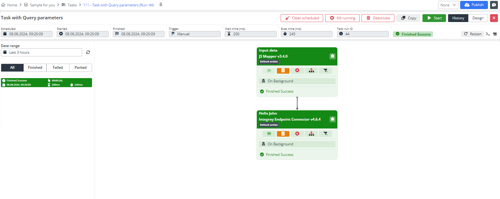 Now that you have started the task with the Integray Endpoint Connector, it automatically triggers the first task just as the Endpoint did in your First integration.