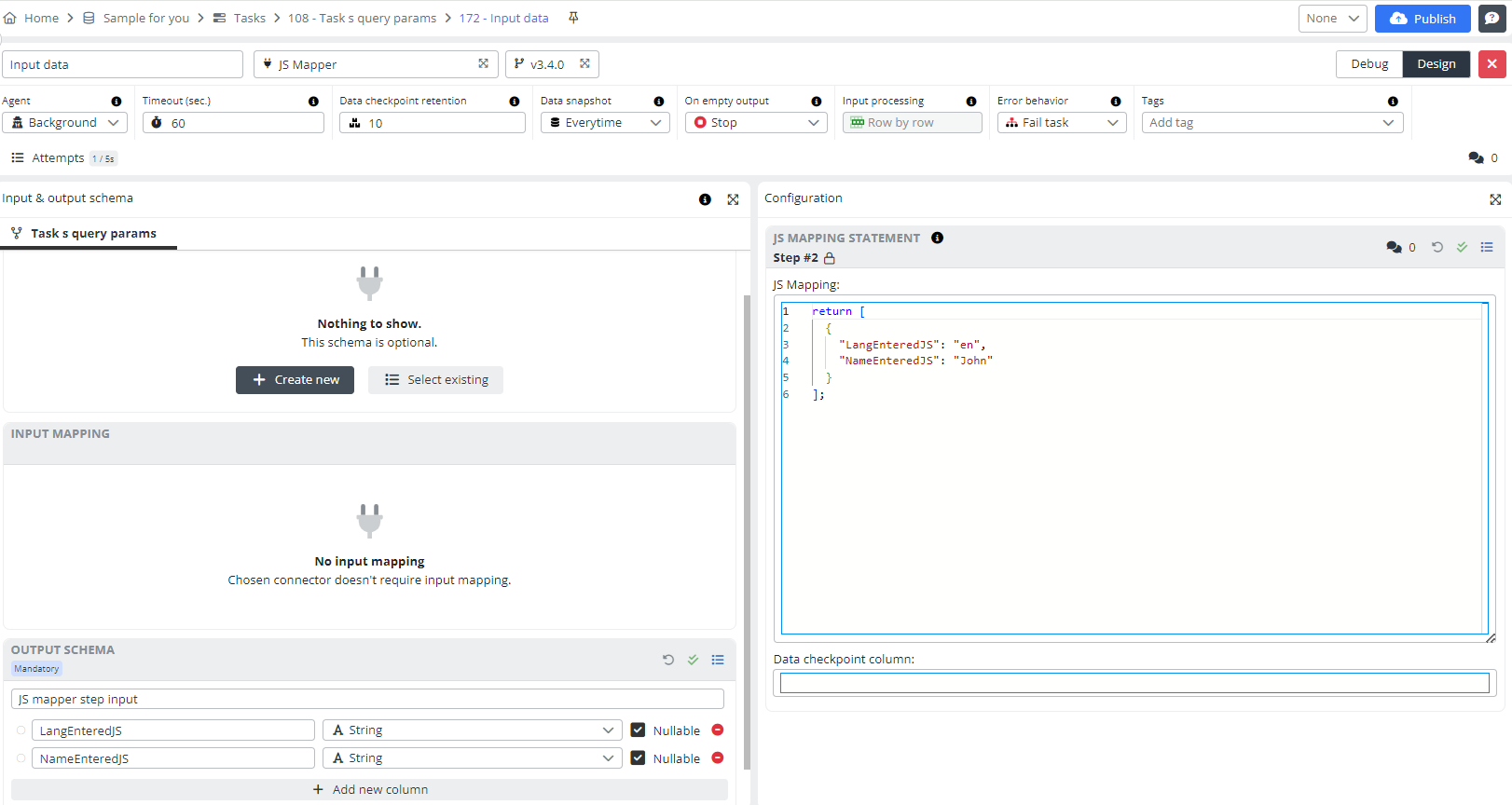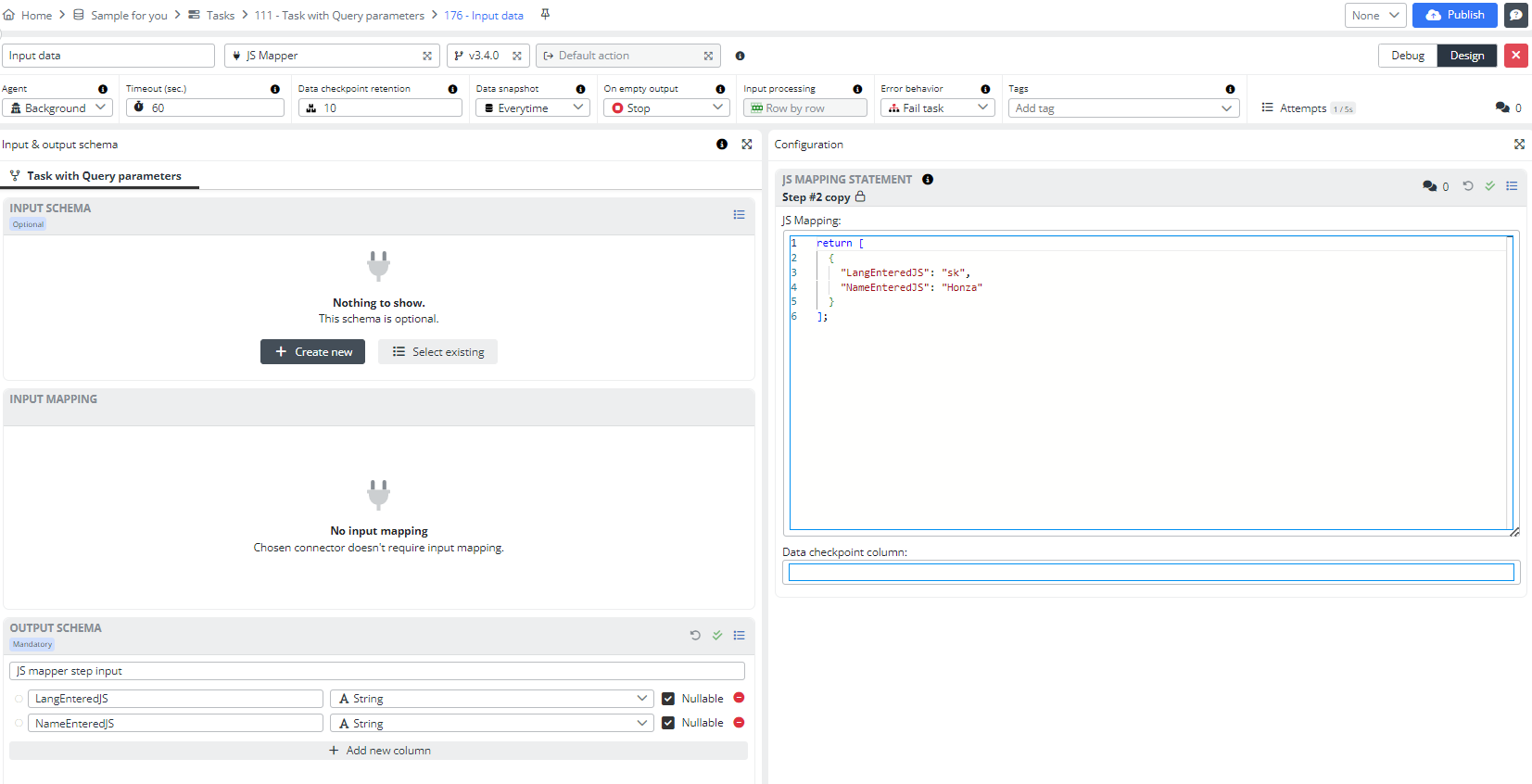 Don't change anything in the second step, just Рublish the Тask and run it. Open the Task History; you will see that the task has finished successfully. Open the Data Snapshot, expand it, and you will see that the language and name have changed. This was made possible thanks to placeholders in the Query parameters.