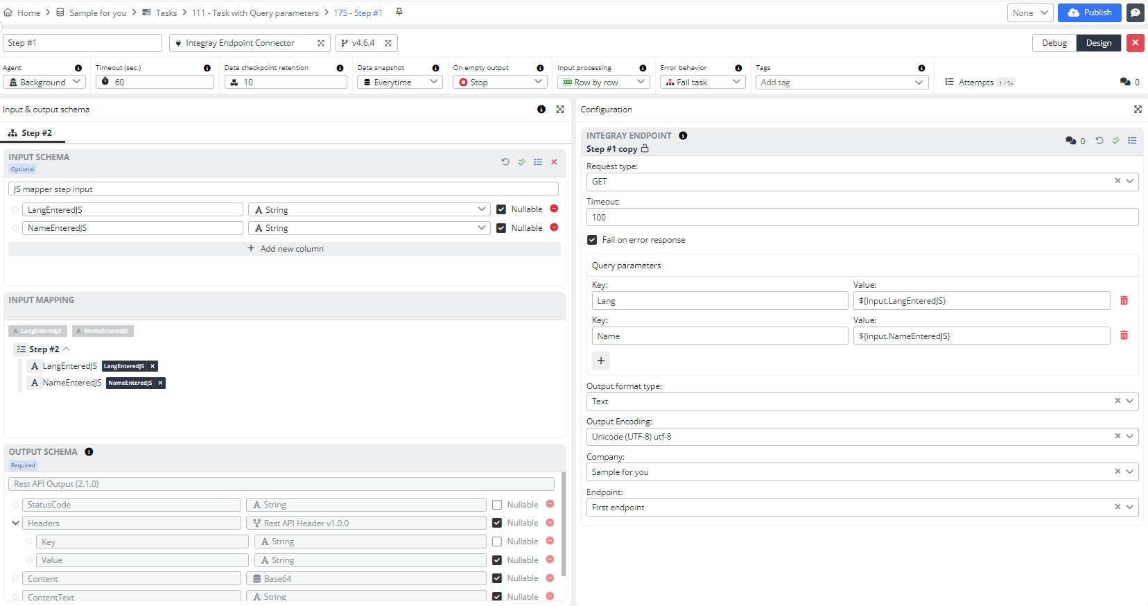 Request type- GET (after that, the Data field will change to Query parameters field)Timeout- 100Fail on error response- mark this checkboxOutput format type- TextOutput Encoding- Unicode (UTF-8) utf-8Company- Sample for your nameEndpoint- First endpointQuery parameters- As you may have noticed, we skipped this field. Now, let's discuss in detail how to fill it out and why.