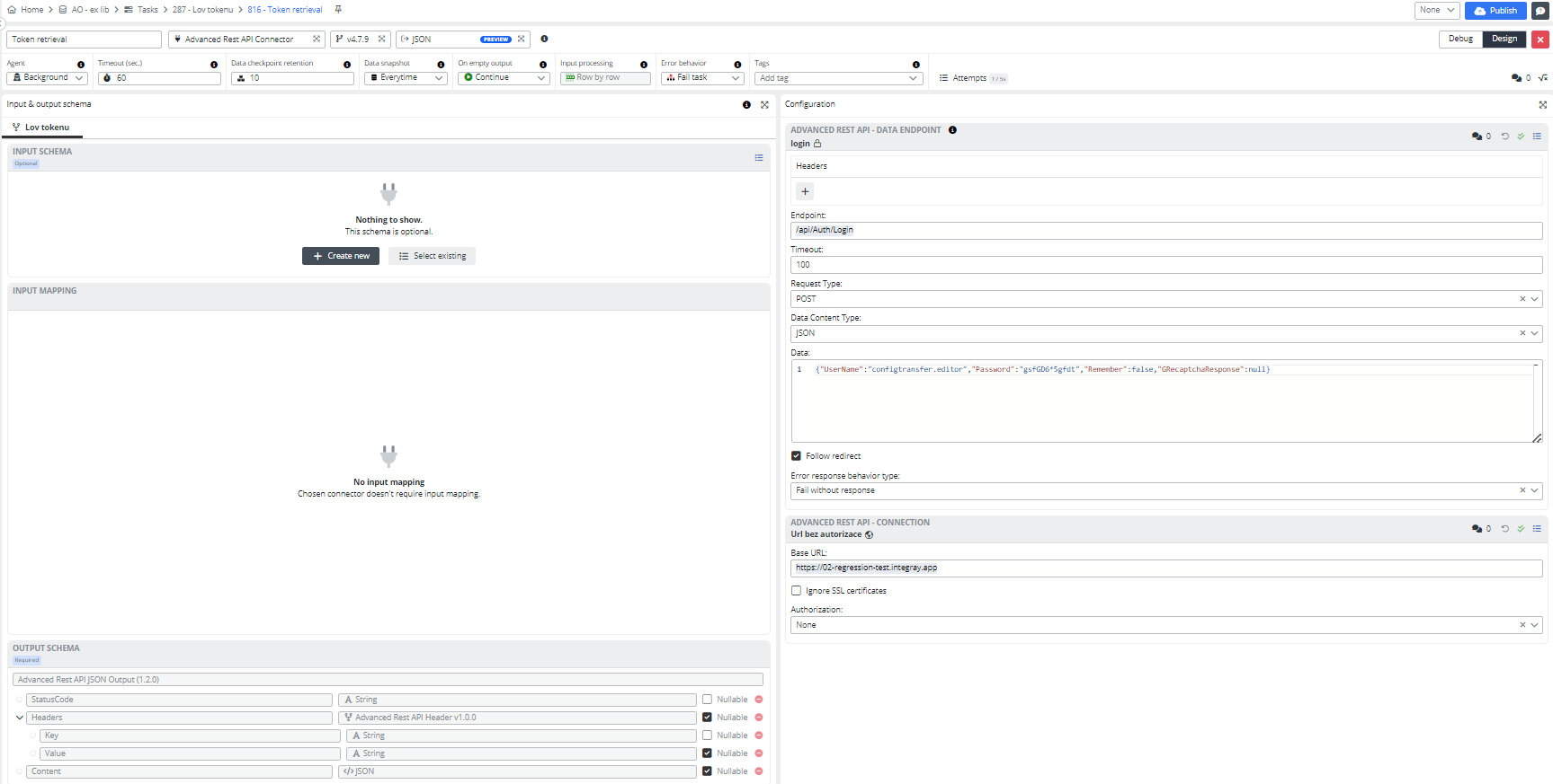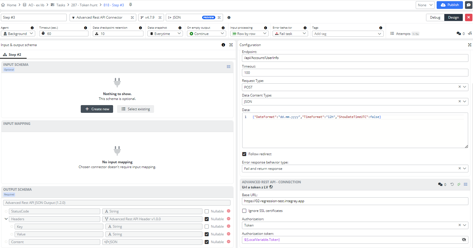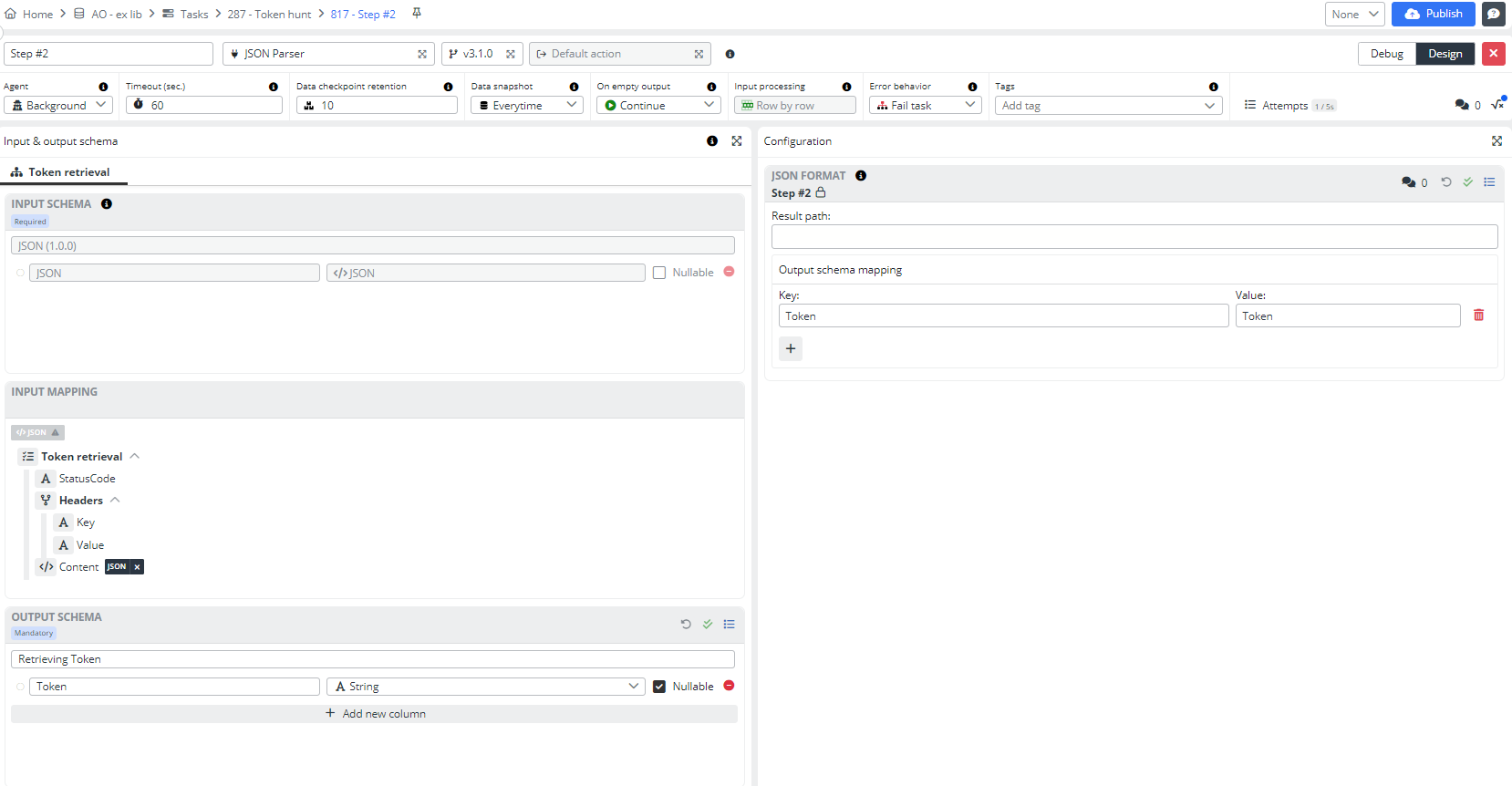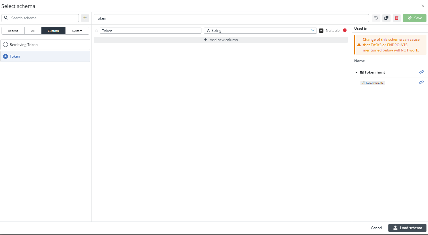 Open the Task step editor. Select the Input schema JSON. Create a new custom output schema and name it Retrieving Token. Add a new column, Token, with the string data type and nullable value. Pin the input mapping.