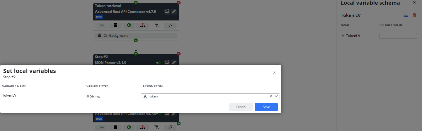 Now, let's fill in the Local Variables. Create a new custom schema and name it Token. Add a new column, Token, with the string data type and nullable value. Use this schema for Local Variables.