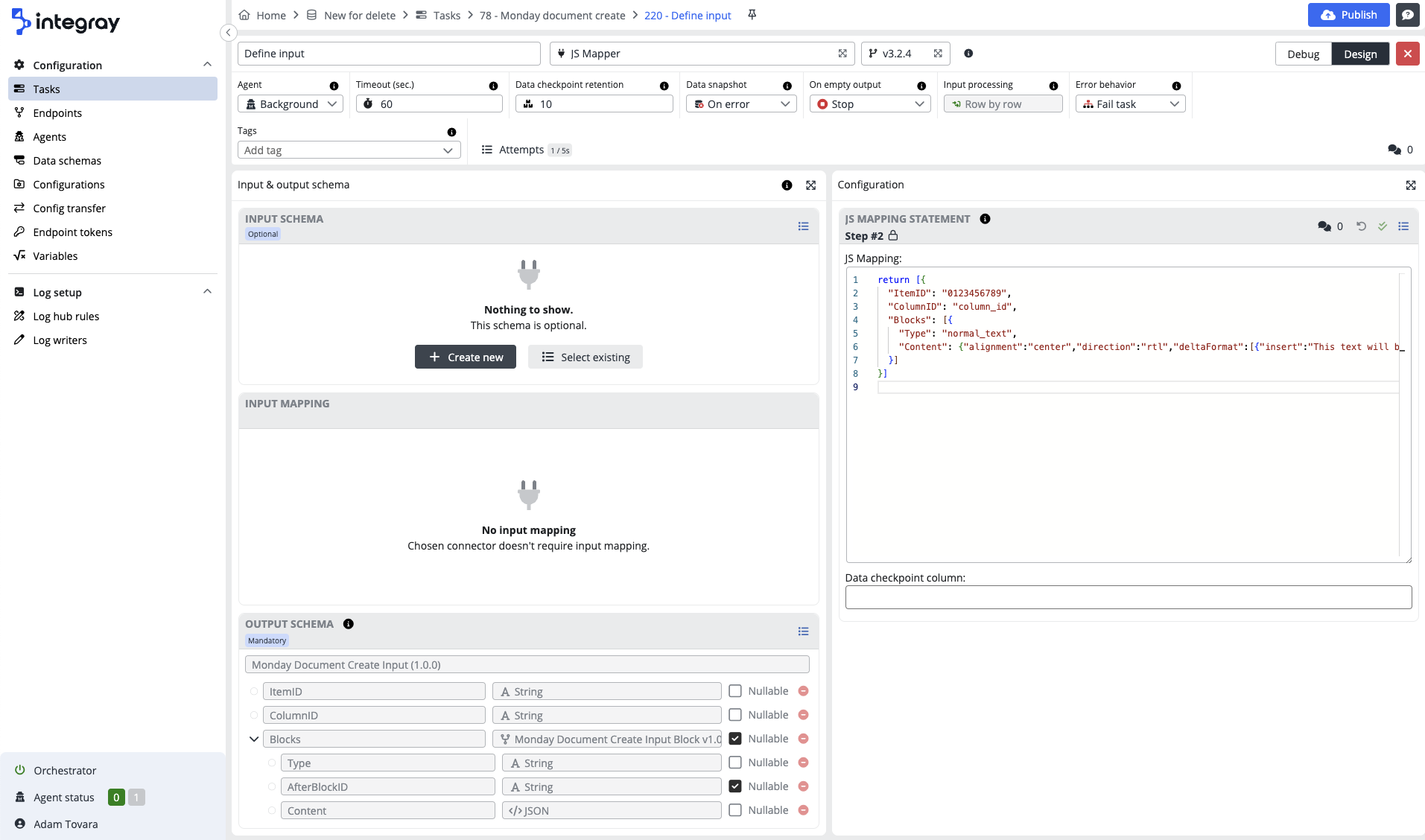 In the Input mapping section, map the values ItemID, ColumnID and Blocks from the input.
