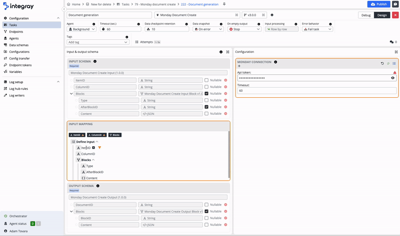 You can find information on obtaining these details on the website support.monday.com. The Api token serves as the authentication mechanism, ensuring secure communication between Integray and Monday.com, while the Item ID and the Column ID identify the specific item and column where a new document will be generated. Once these prerequisites are met, you can seamlessly proceed with configuring the connector.