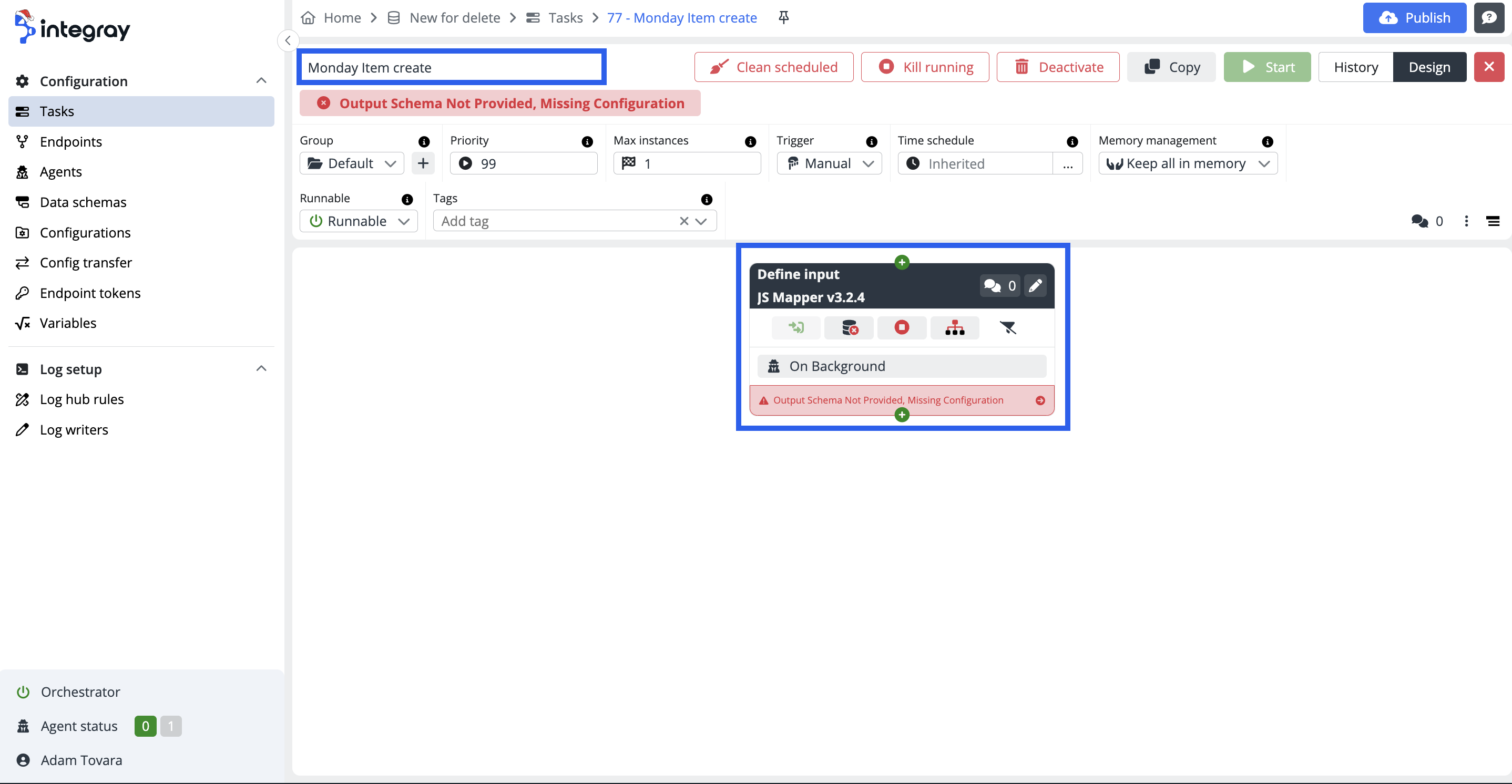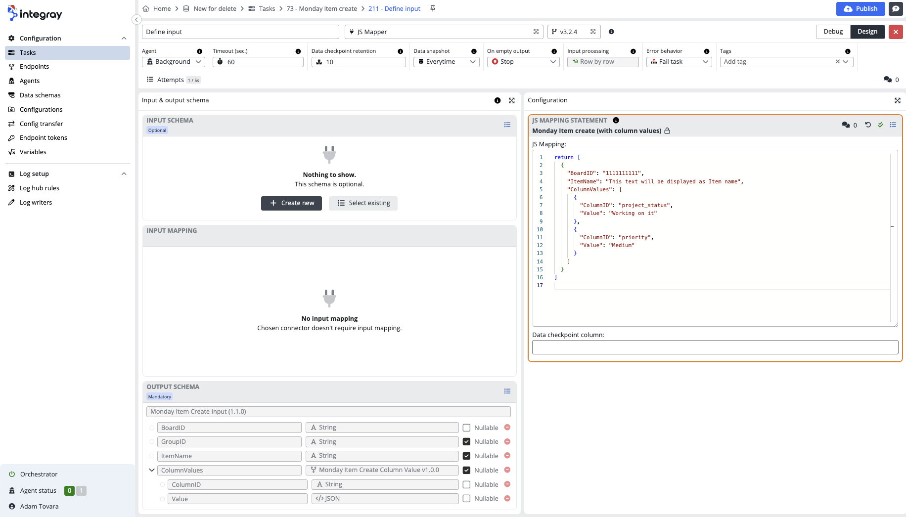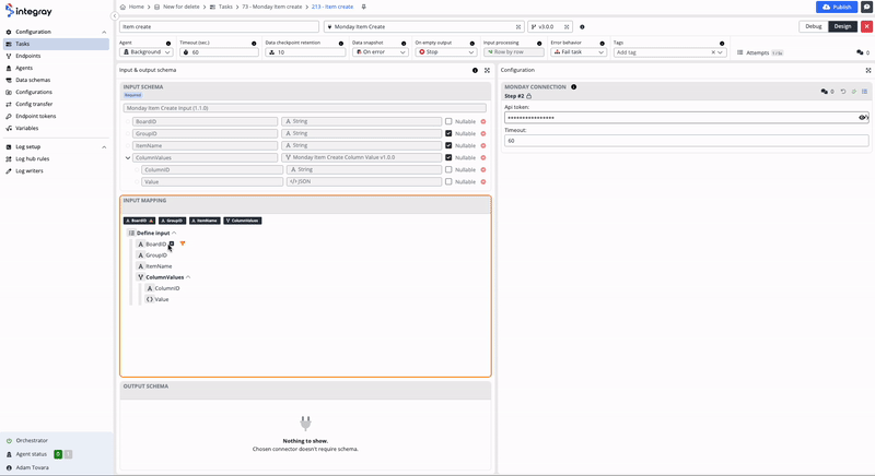 In the Input mapping section, map the values BoardID, ItemName and ColumnValuesfrom the input.