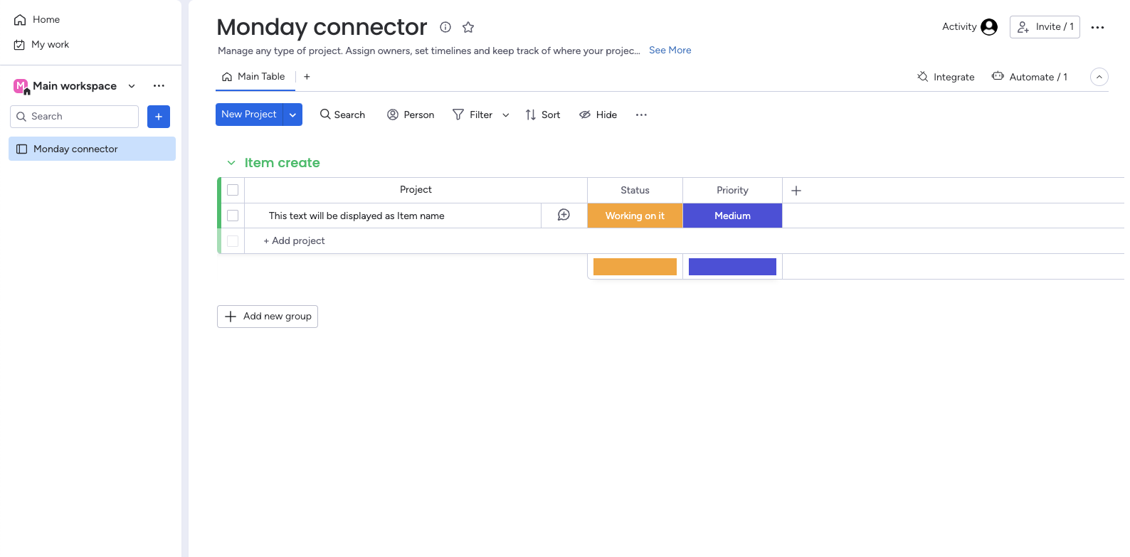 After successfully executing the task, a new item will be created in the specified Monday.com board. The item will be populated with the relevant details based on the configured parameters, including values for the Priority and Status columns.