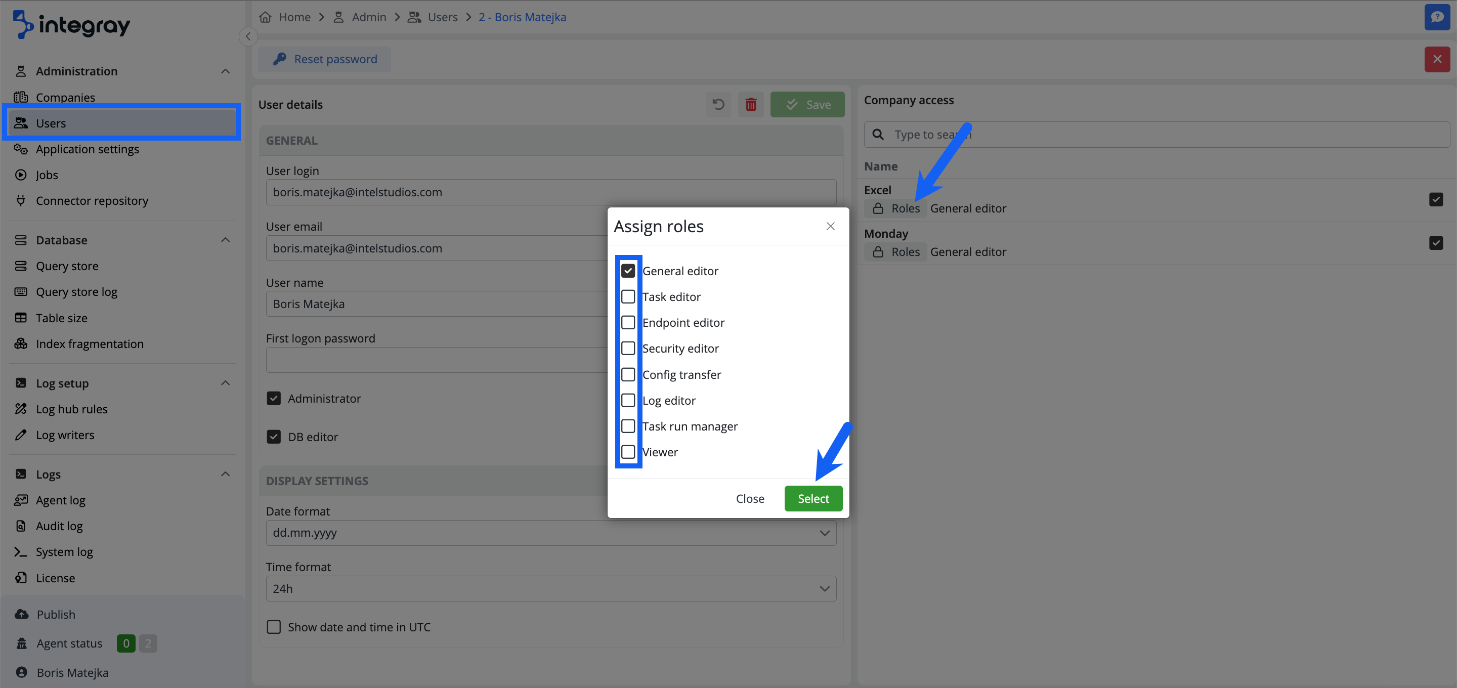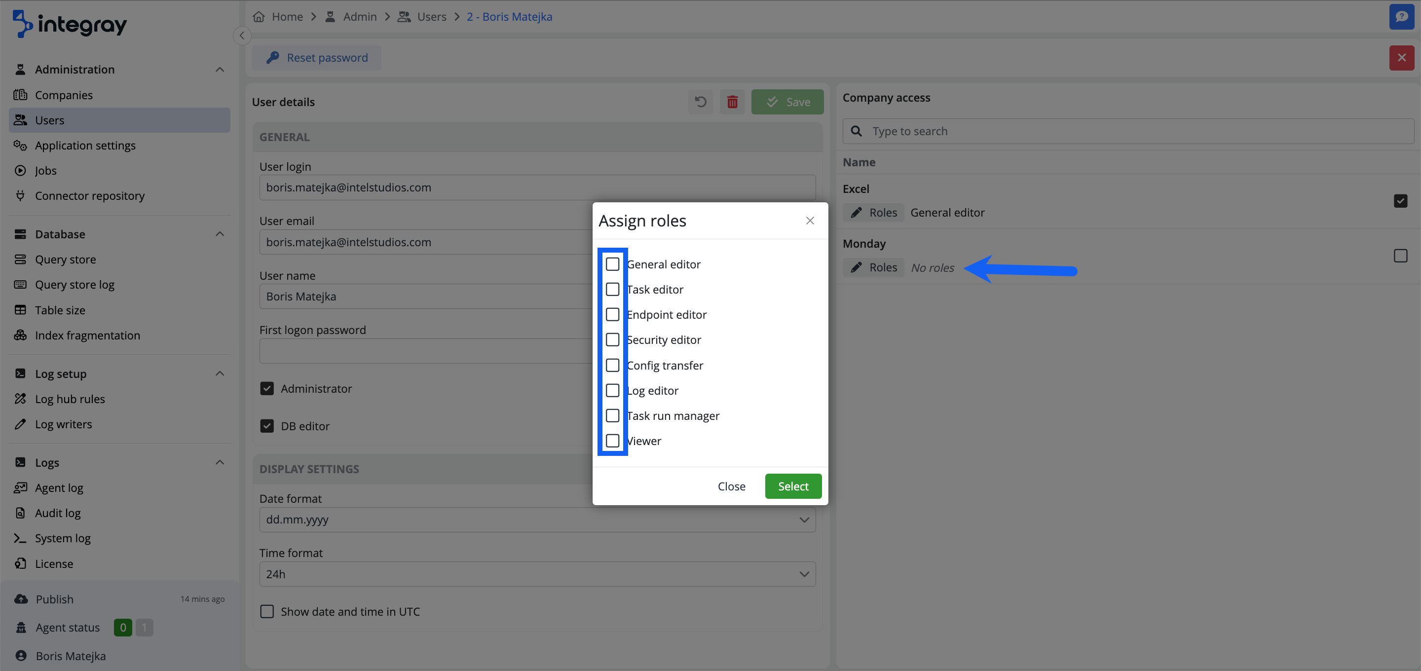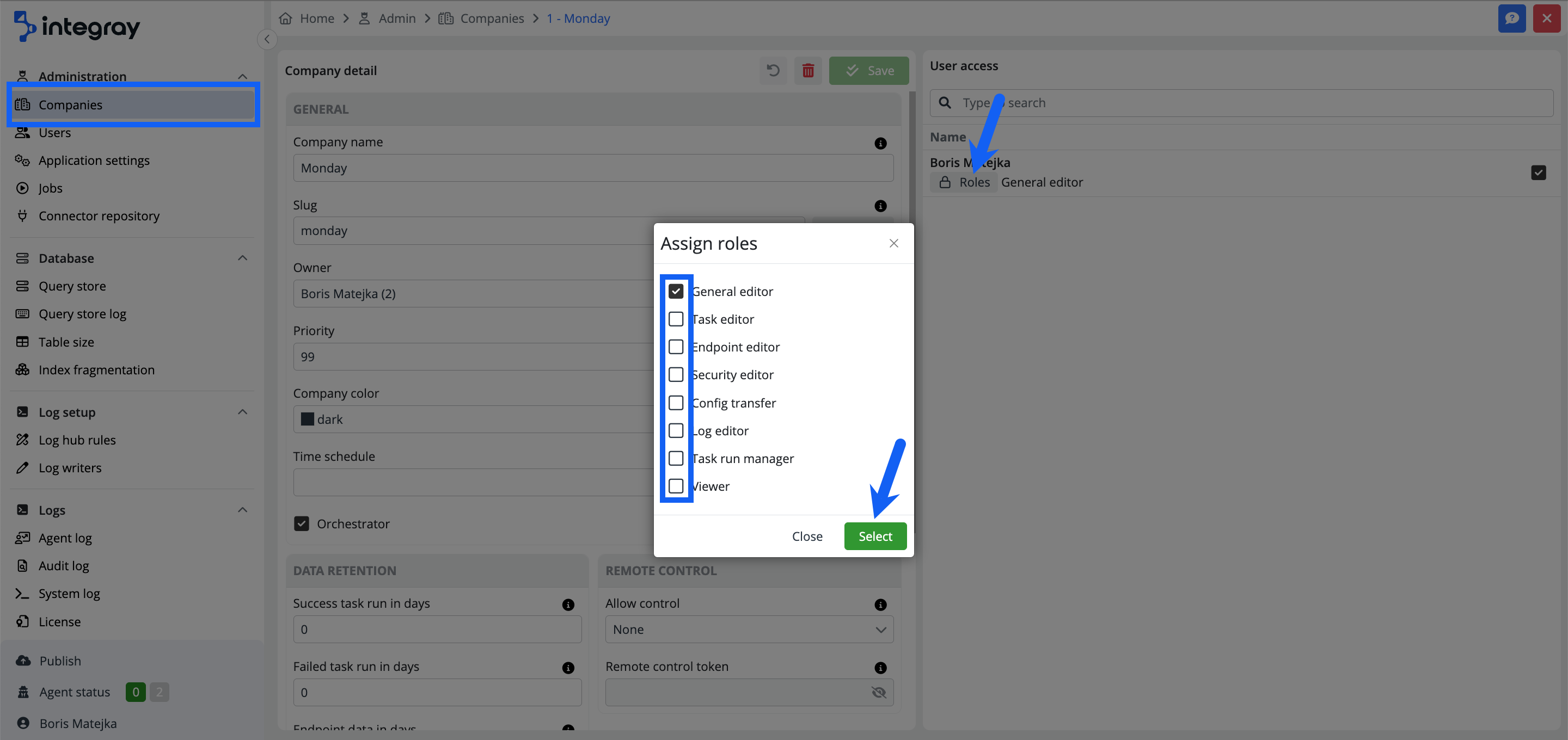 The second method is through the Basic role, which is automatically assigned to all new Integray users. This role grants the user access to create a new Company. By creating a new Company, the user obtains a new General editor role specific to the newly created Company. This role allows the user, among other things, to assign roles to other users based on their work needs. In the Company detail view, click the Roles button or check the checkbox next to the user's name to display a menu of available user roles. Then, choose the desired roles and click the Select.