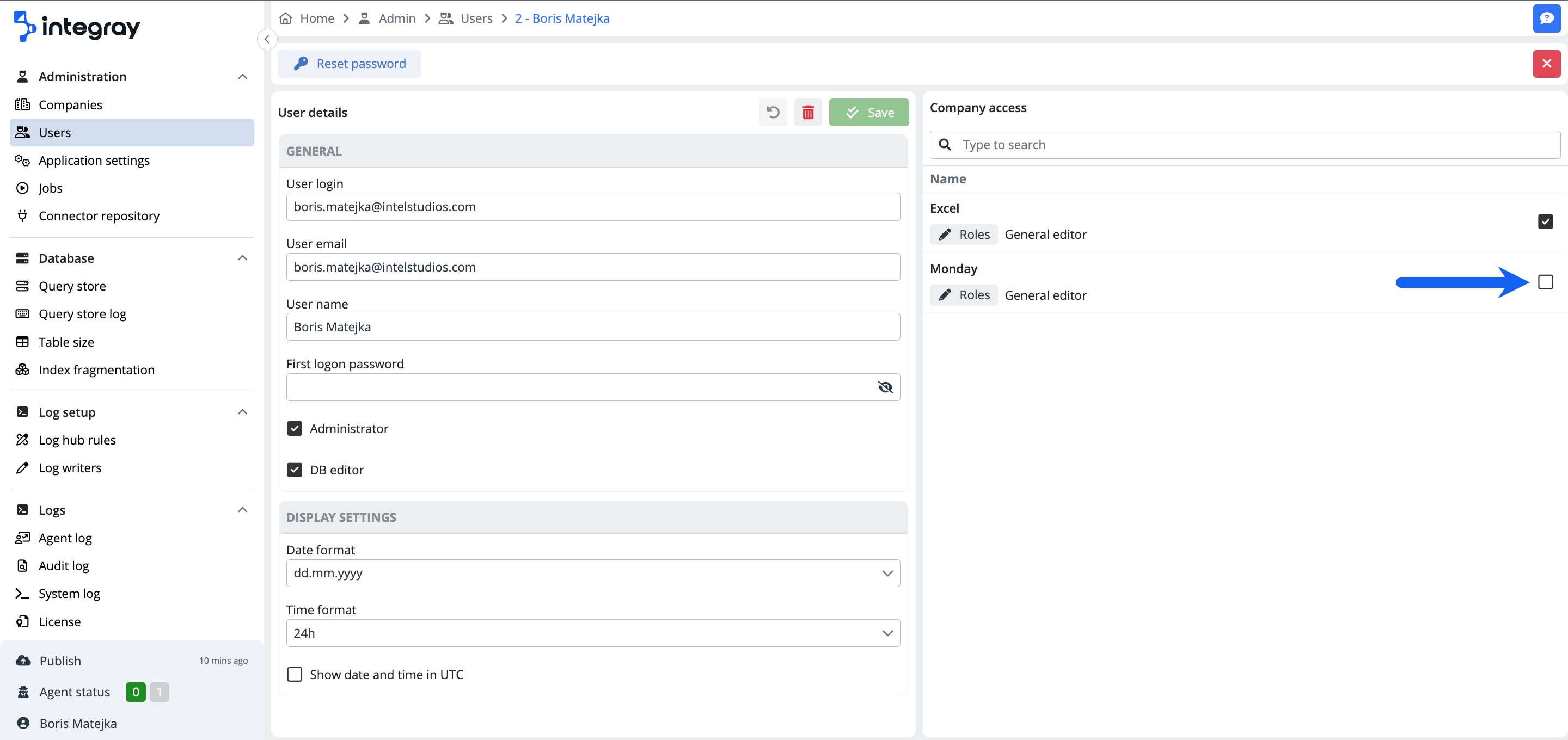 There are two methods to assign user roles to a user. The first method is through the Administration section, which is accessible only to users with the Administrator role. To access the Administration, click on the username in the lower left corner and press the Admin button. Next, navigate to the Users in the left sidebar and select the user to whom the new role should be assigned. In the Company access area, check the checkbox next to the desired Company (or click the Roles button) to display the menu of user roles. Then, choose the desired roles and click the Select.