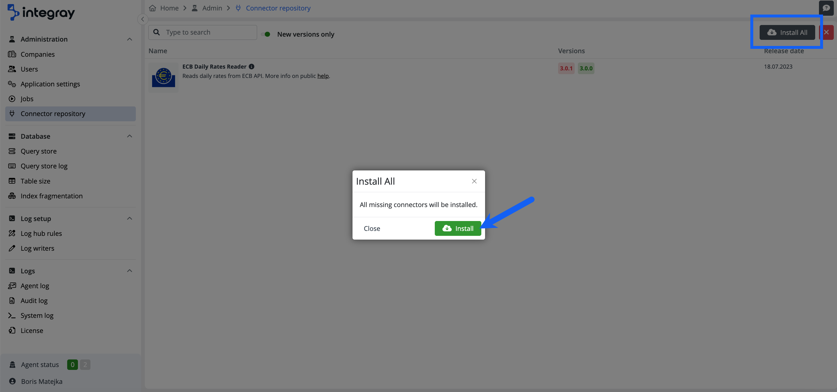 The Install all button drives the connector installation actions. By clicking on the button, the system will inform you that all missing connectors will be installed. You have to reconfirm the action and click the Install button.