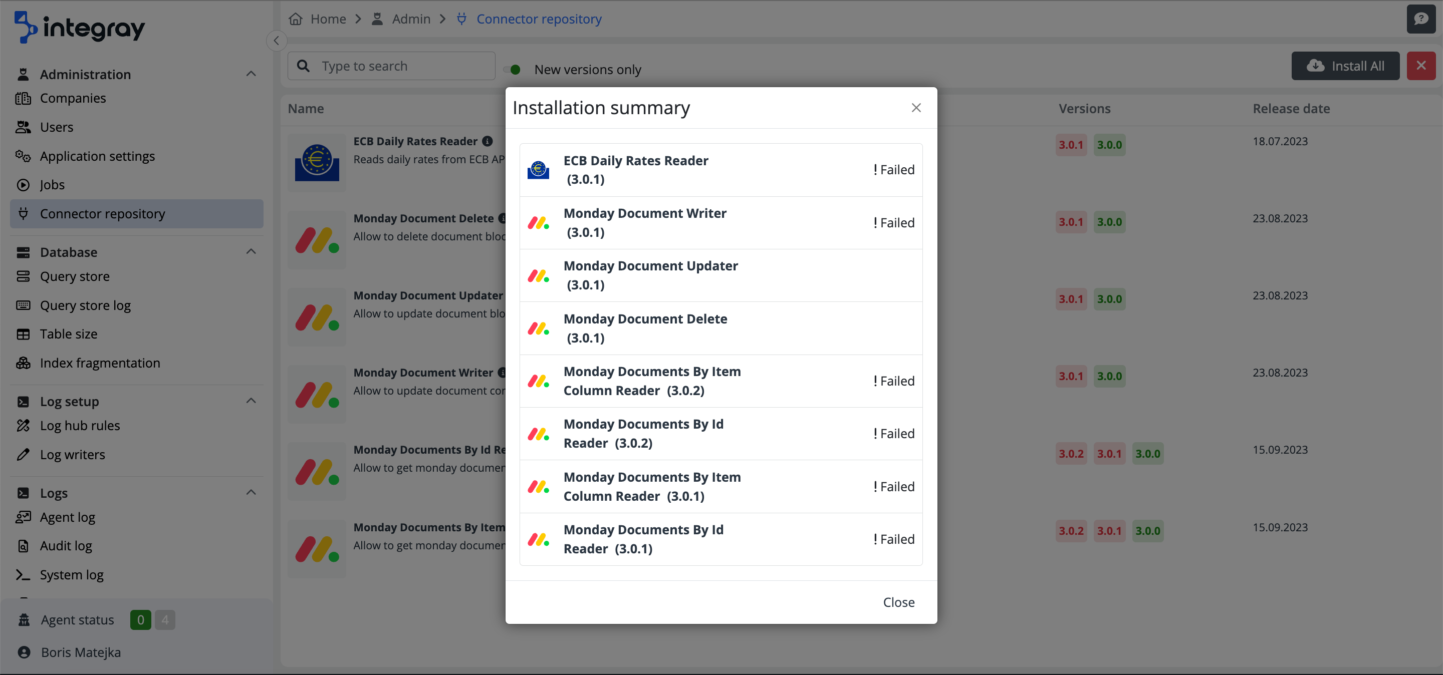Click the Install button and confirm your selection. The confirmation triggers the installation action in the background. If everything does install correctly, the entire list of connectors will have displayed the green badge All versions installed. In case of failure, the system will display a modal window Installation summary listing the connectors with failed installations.