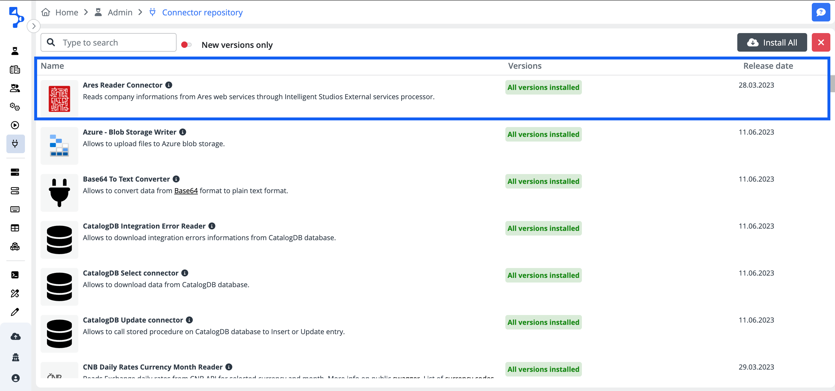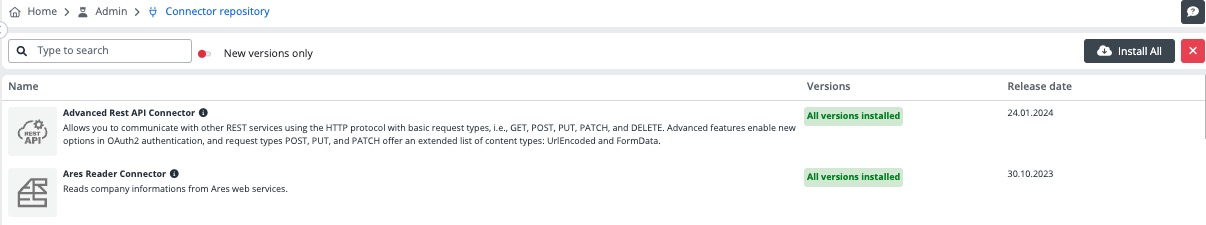 This is the location, where you can see and manage the available connectors. You can access this location only with the access rights of the Administrator. None of the other roles can access the administration and therefore can't manage the installation and or update of the connectors.