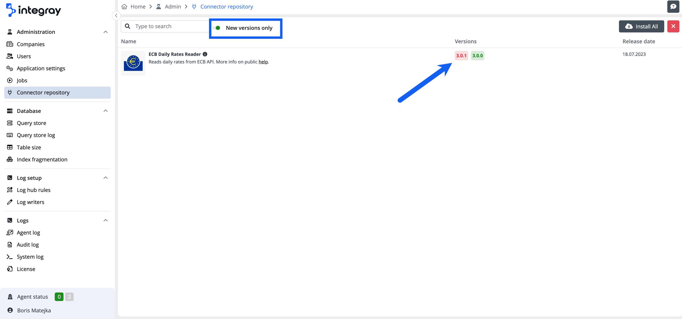If you switch on The new version only toggle button (green), the connectors' list will display only the ones where the new version of the connector is not installed.