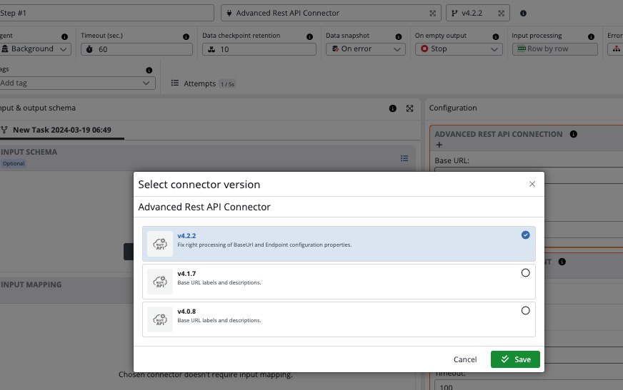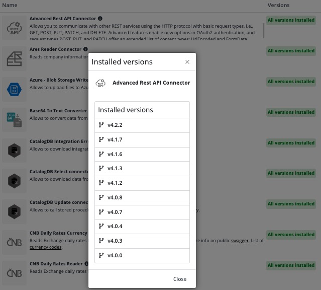 The list of connectors contains all available connectors and their installed versions ready to be used in the integration task steps configurations.