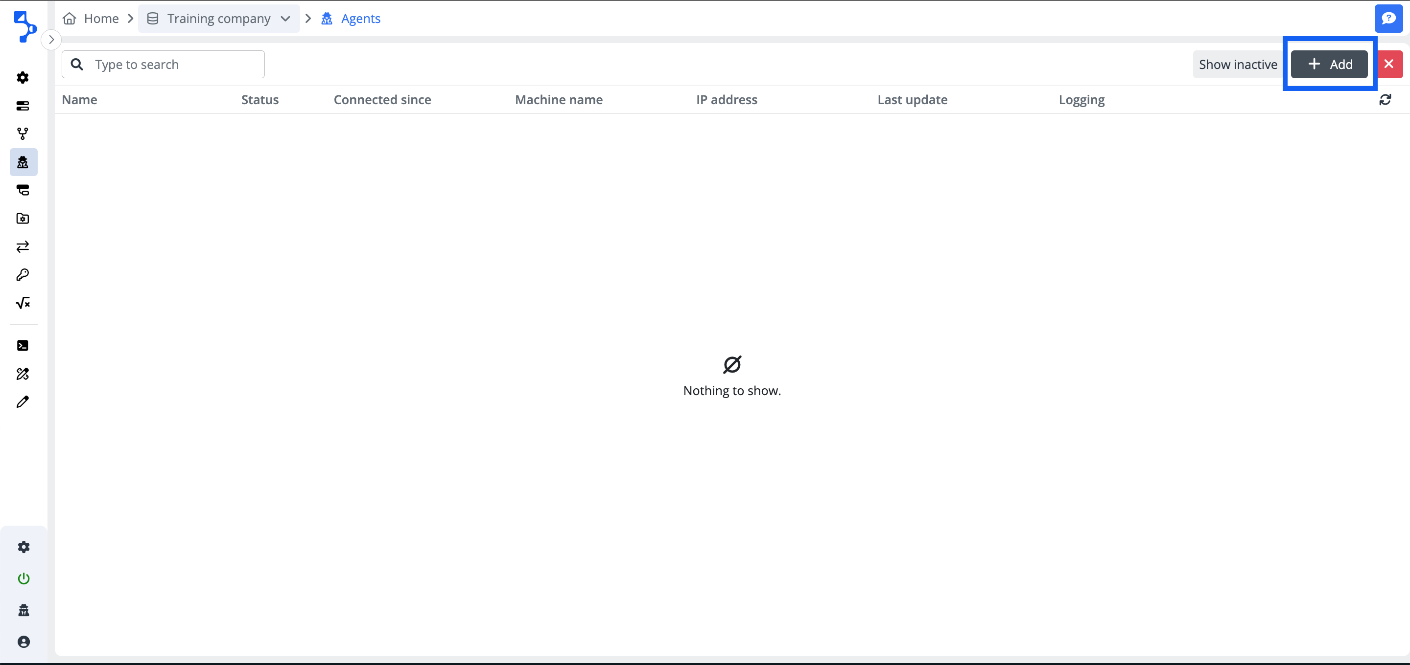 Open the company screen and select the Agents on the left content navigation menu. You will enter the agents' list. In case you are going to create the first agent for the company, the list will be empty with the message "Nothing to show". This is going to be your starting point for the new agent creation.