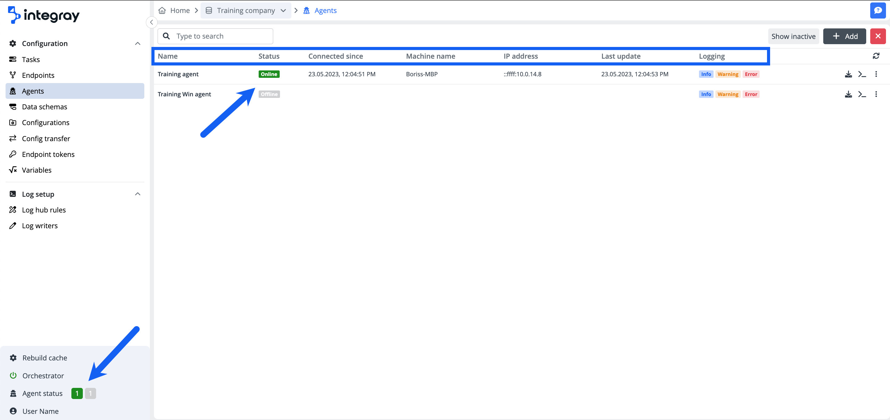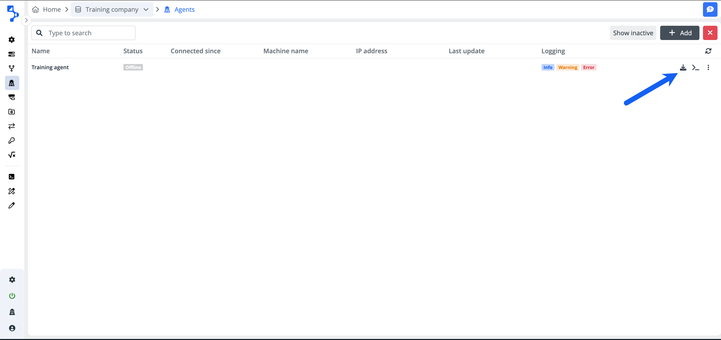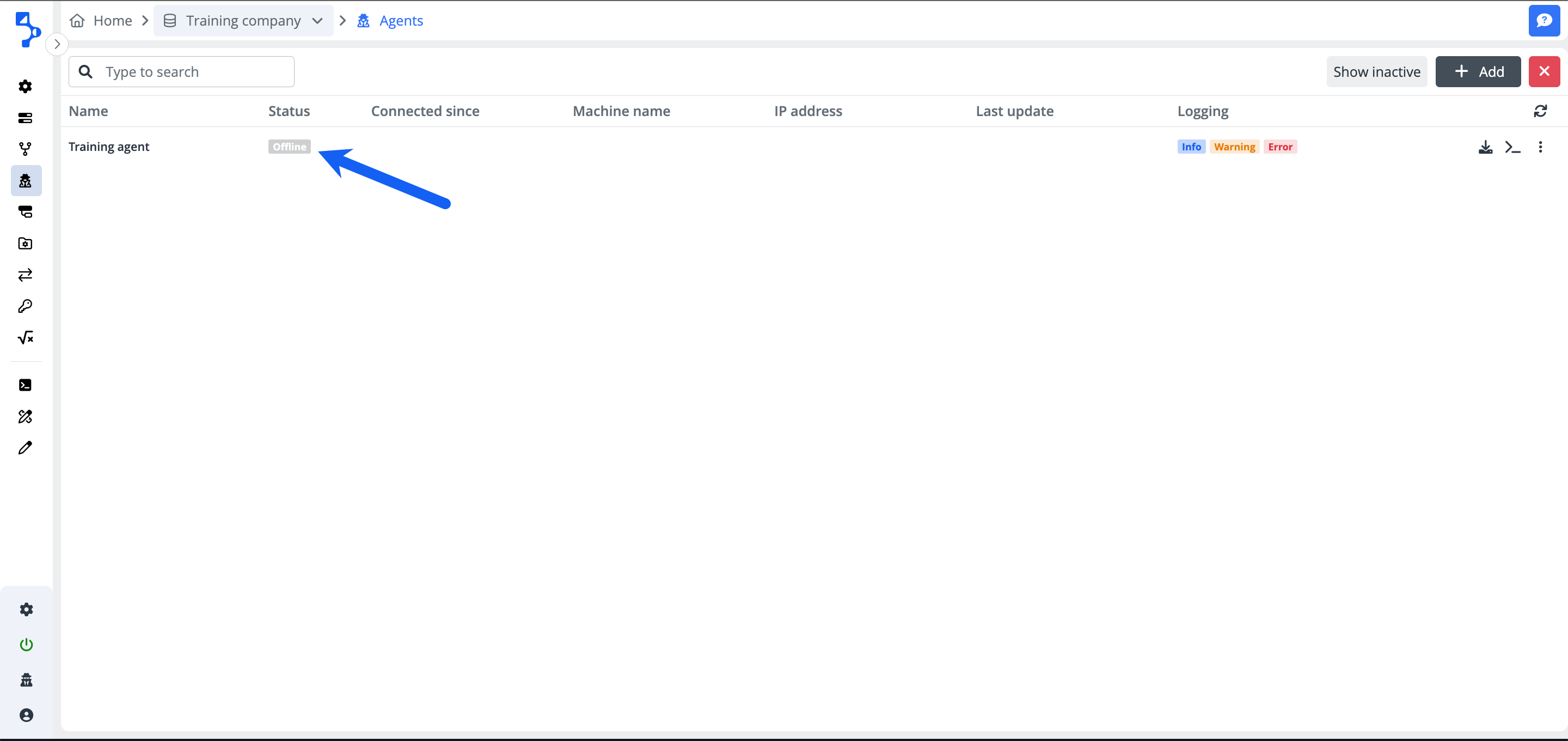 You will find all information about the agents in the agent list. The default view is set to show the active agents, but you can switch between the active and inactive agent view using the button Show inactive/Show active.