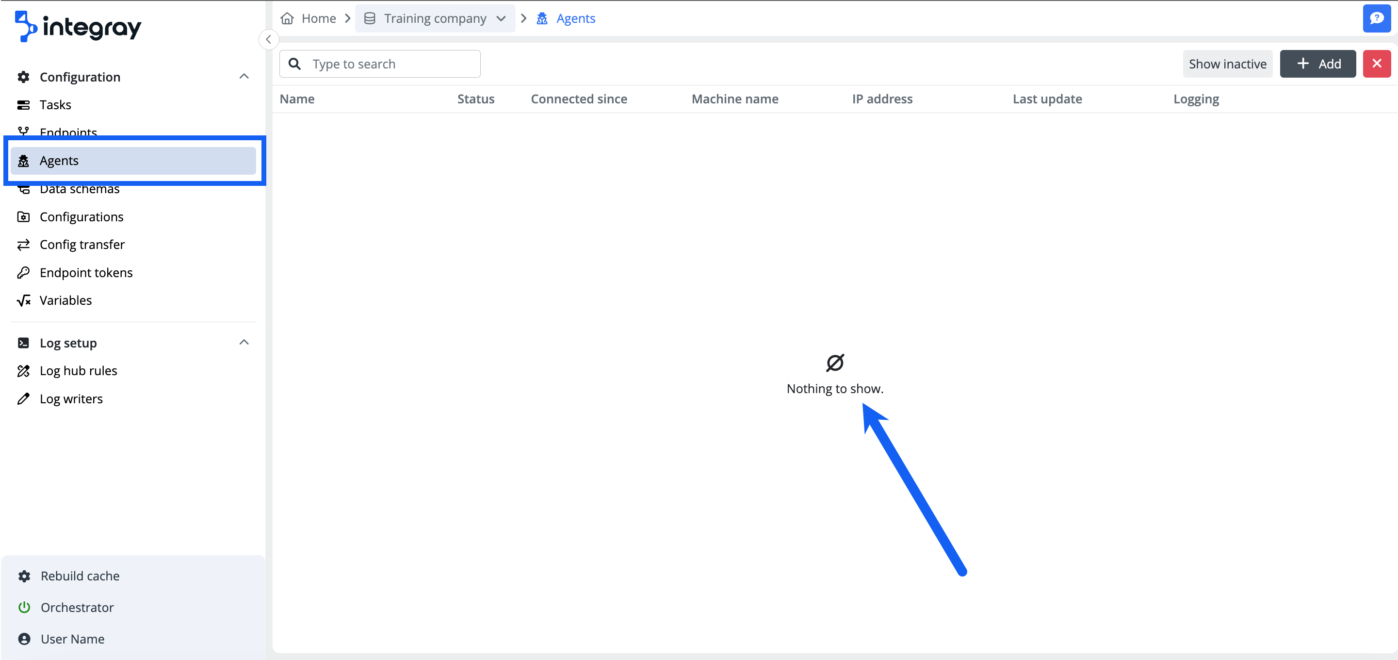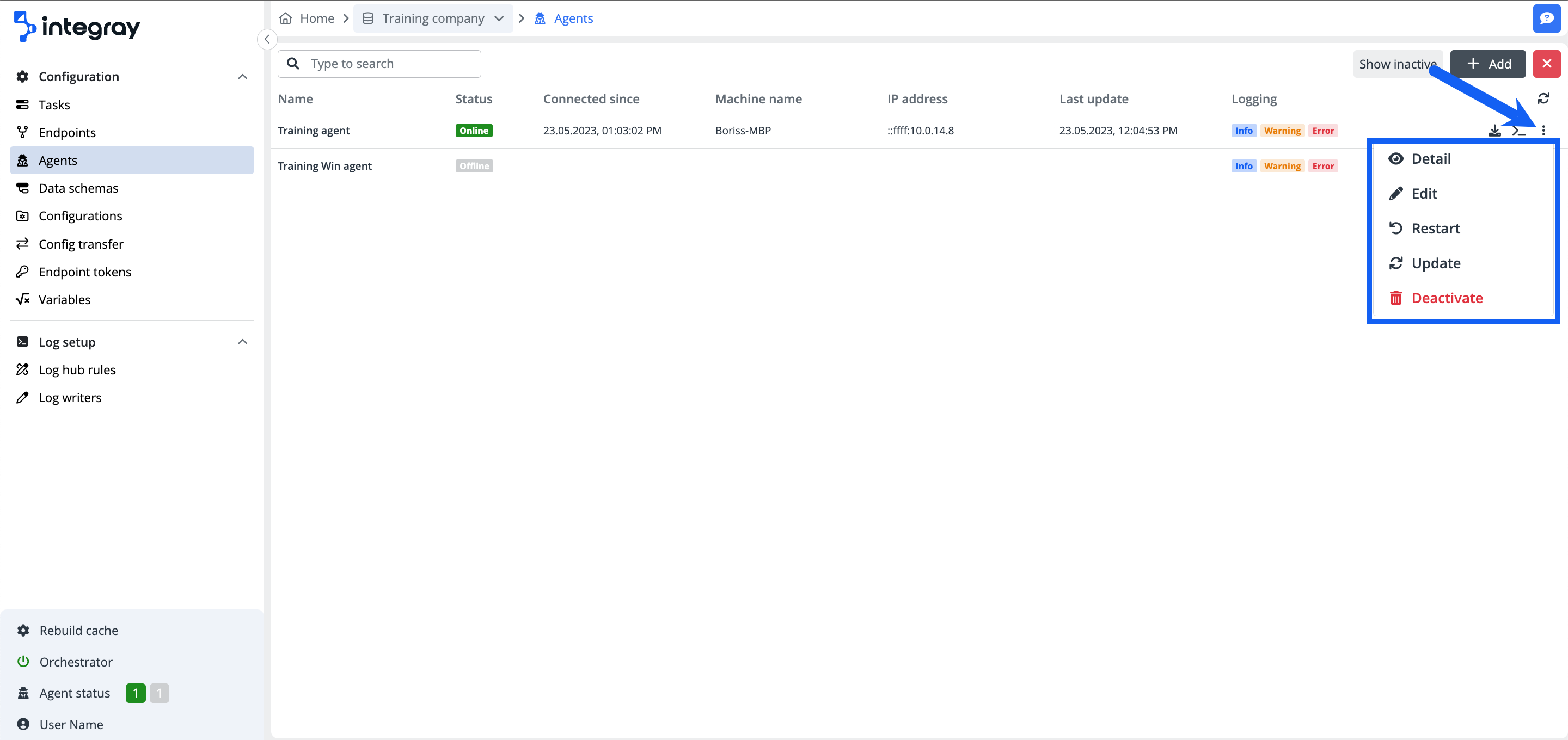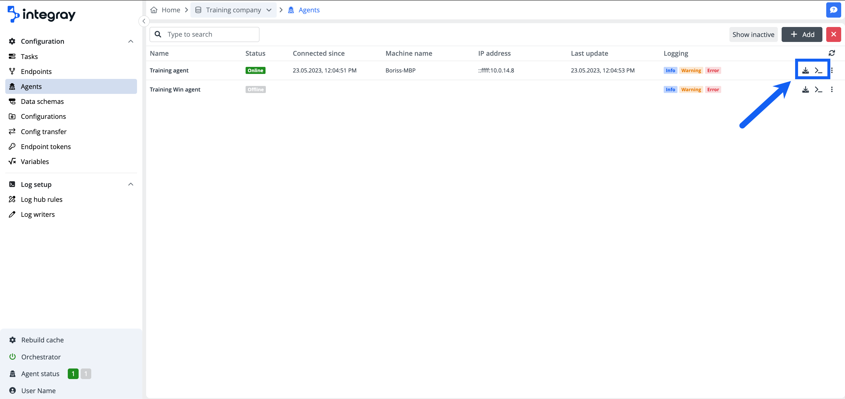 You will find all information about the agents in the agent list. The default view is set to show the active agents, but you can switch between the active and inactive agent view using the button Show inactive/Show active.