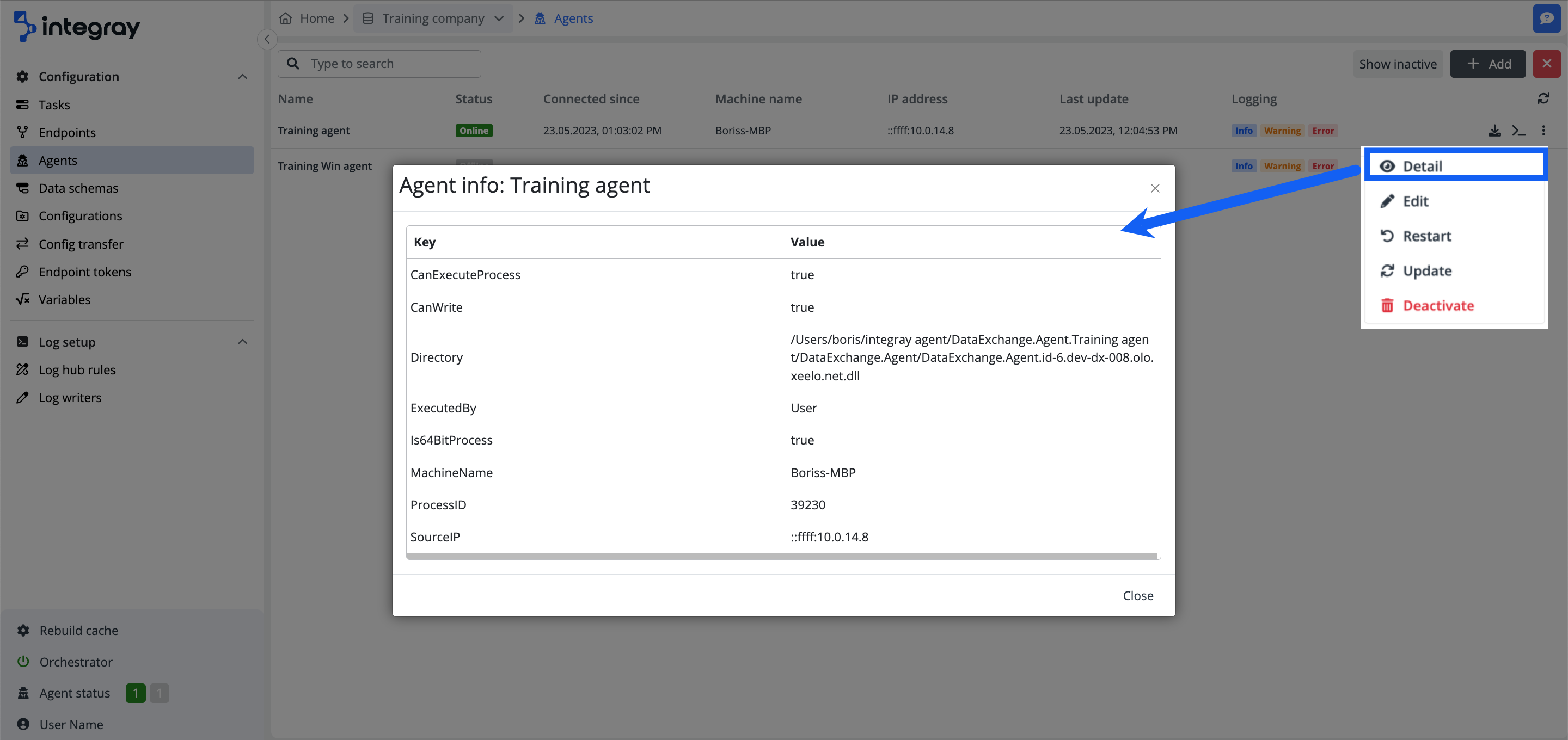 Agent log - Navigates directly to the agent log of the respective agent.