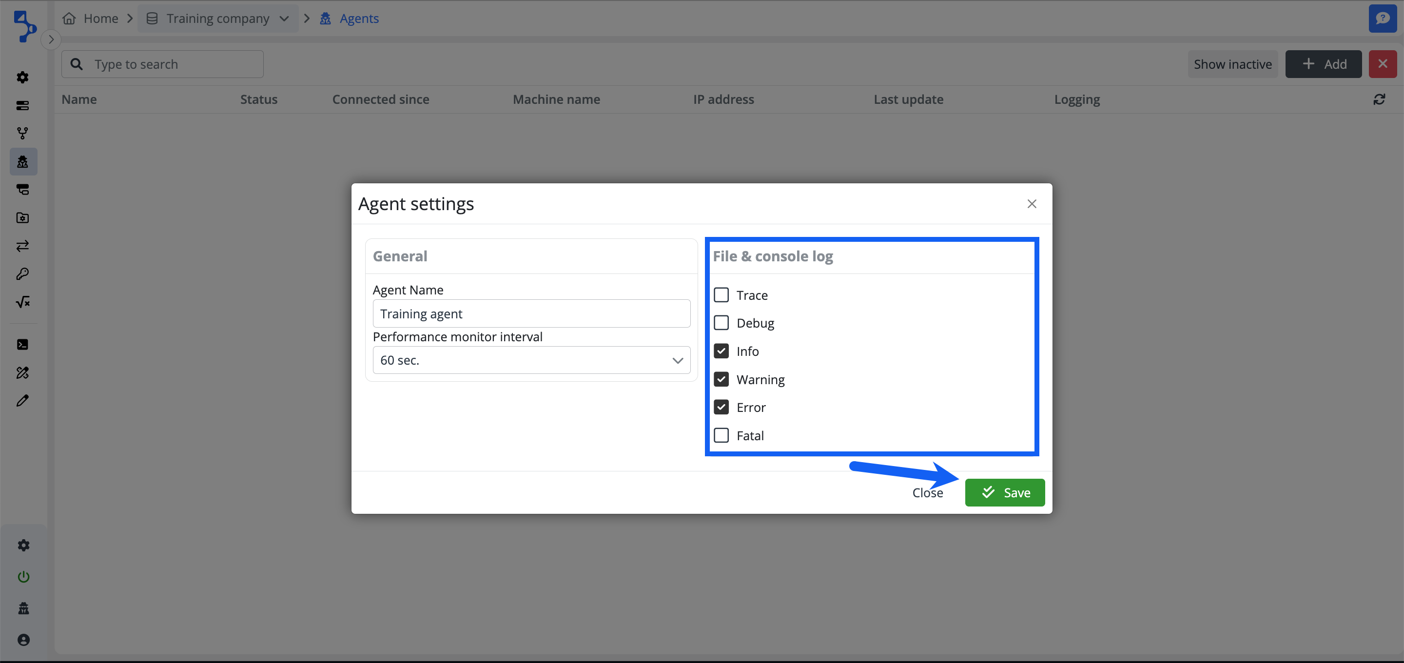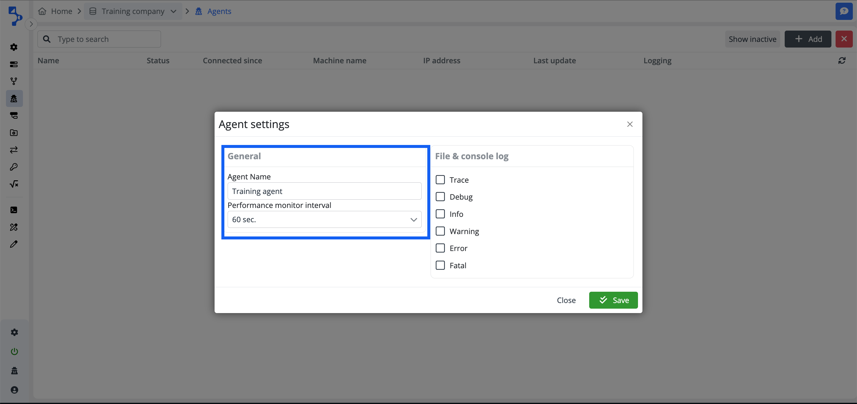 Click the +Add button to open the Agent settings modal window to configure the agent's general settings and the file & console log levels.