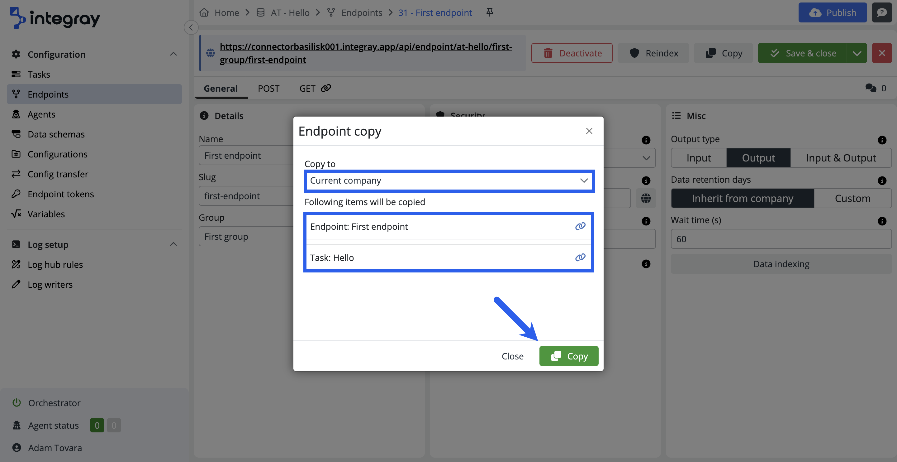 Click the Copy button to copy the endpoint and its configuration to the same or another company within the installation.