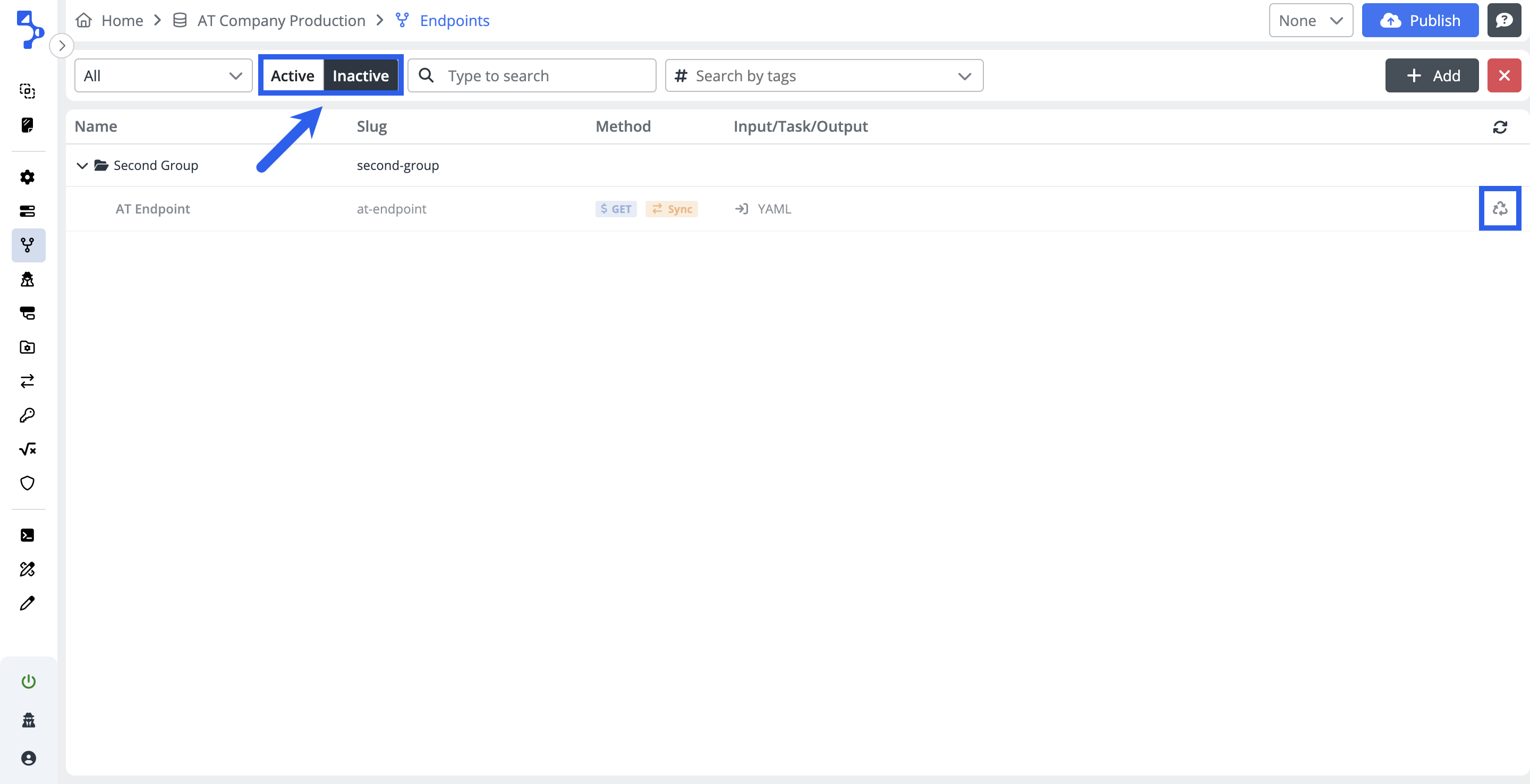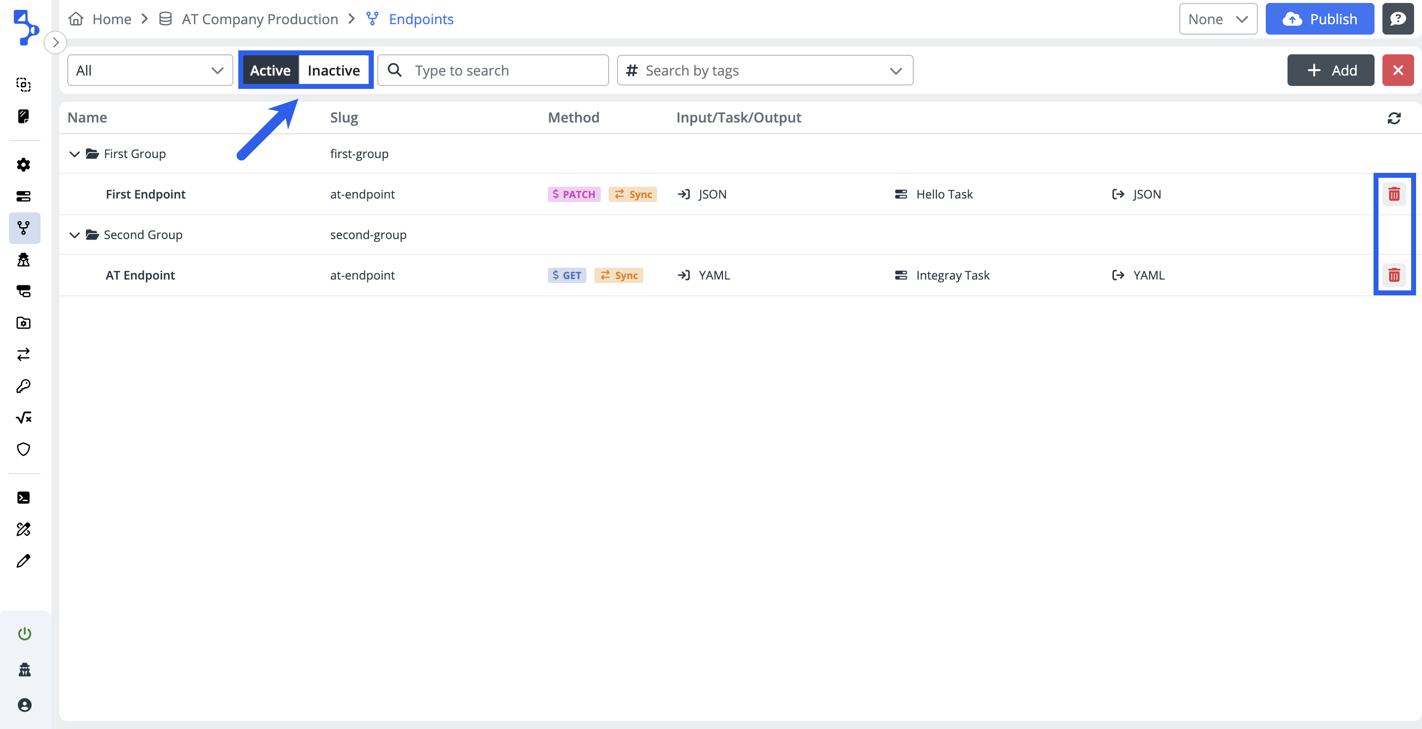 The endpoint record row includes additional controls with dynamically changing icons of a trash bin and recycling, allowing users to deactivate and reactivate the endpoint as needed.