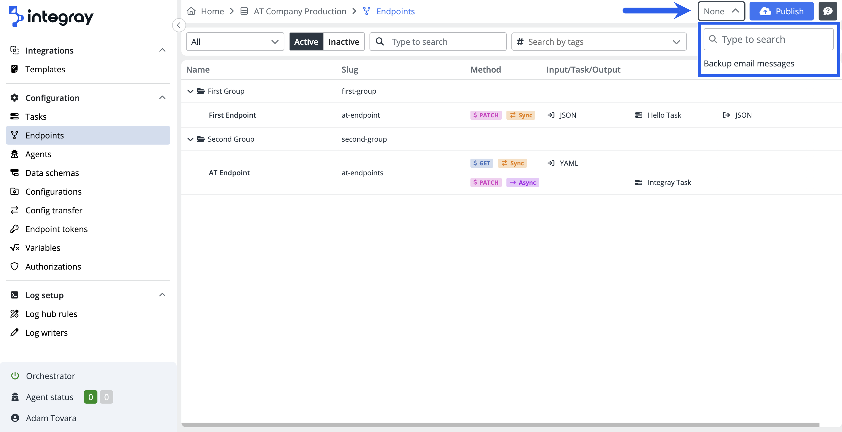 By default, the endpoint list displays endpoints that any users have configured. If you want to view endpoints based on an applied Template, look to the upper right corner, next to the Publish button, where you'll find the Template selector. You can choose a specific template, and based on that selection, endpoints from the applied template will be displayed in the endpoint list. This feature lets you quickly switch between different sets of endpoints.