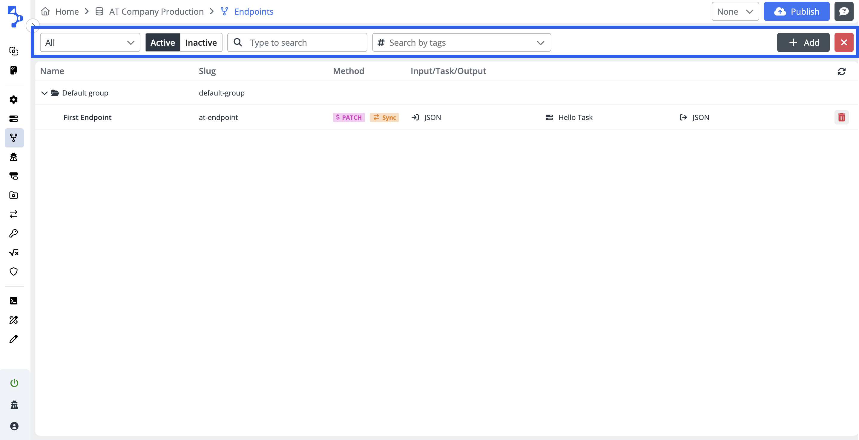 In the upper section of the Endpoint List interface, you will find buttons for filtering endpoints according to the utilized methods—be it ALL, GET, POST, PUT, DELETE, PATCH. Moreover, there's a filter option for displaying Active or Inactive endpoints. The interface also provides a user-friendly search field, enabling you to locate specific endpoints quickly. Next to the search field, there is also an option to search by tags, making it even easier to find and manage your endpoints based on specific criteria.