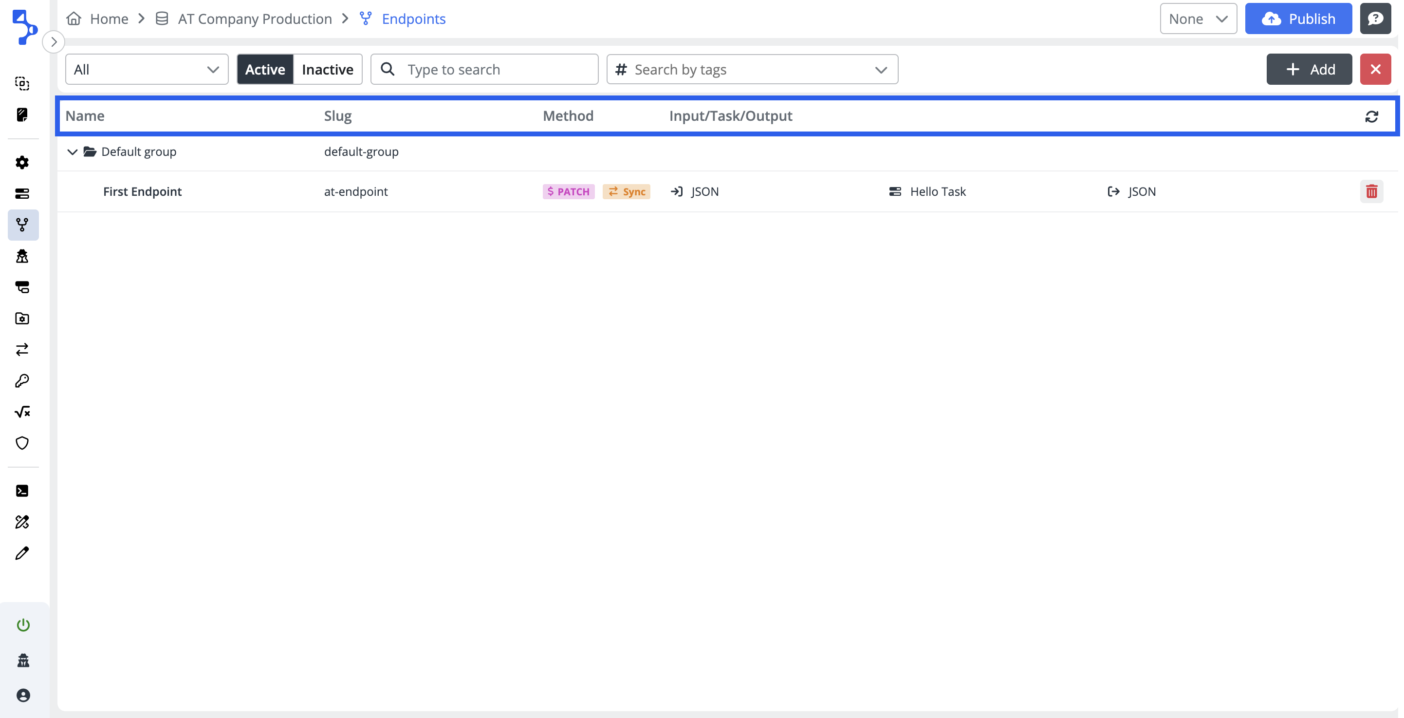 On the right side of the screen, there are two additional buttons: the +Add button initiates the configuration of a new endpoint, opening the endpoint editor for further customization. And the Close button (depicted as a red square with a cross) facilitates exiting the endpoint editor and returning to the Task list.