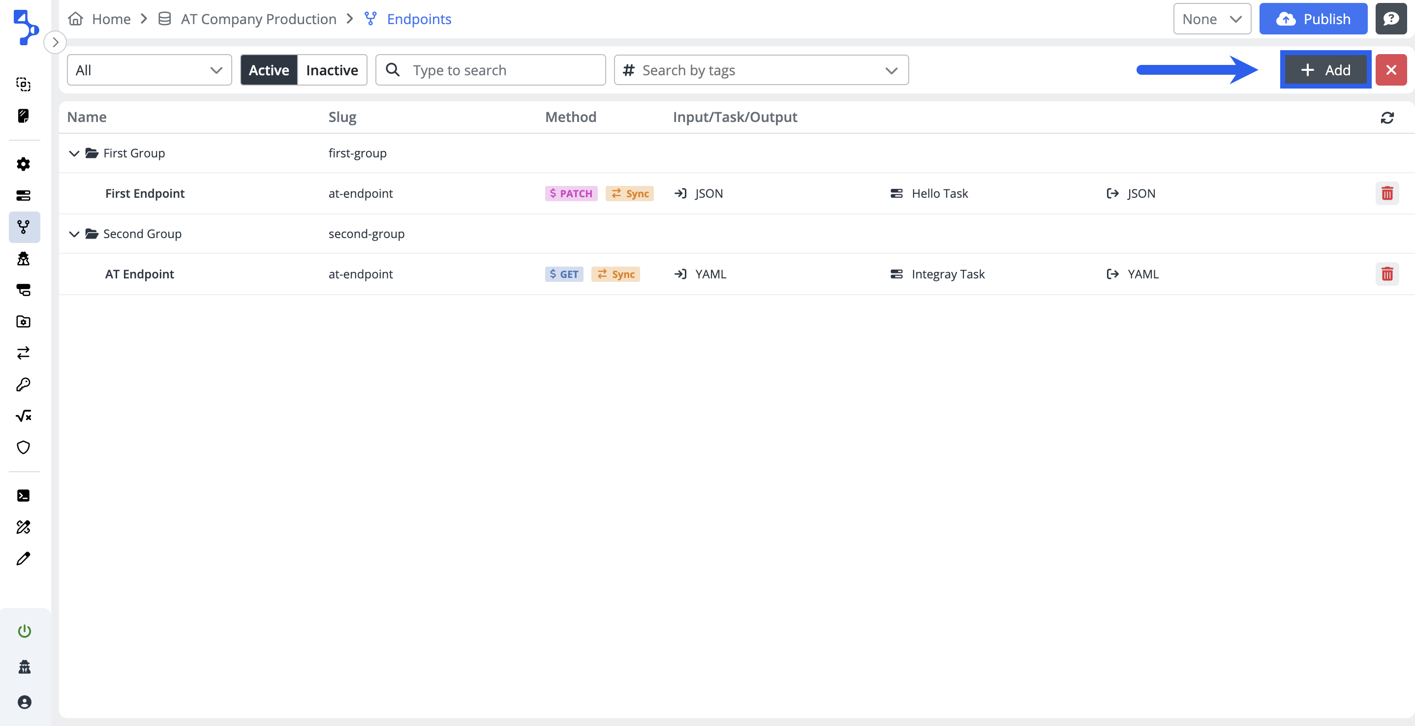 To create a new endpoint click the +Add button located in the top right corner of the screen. You will navigate to the Endpoint editor.