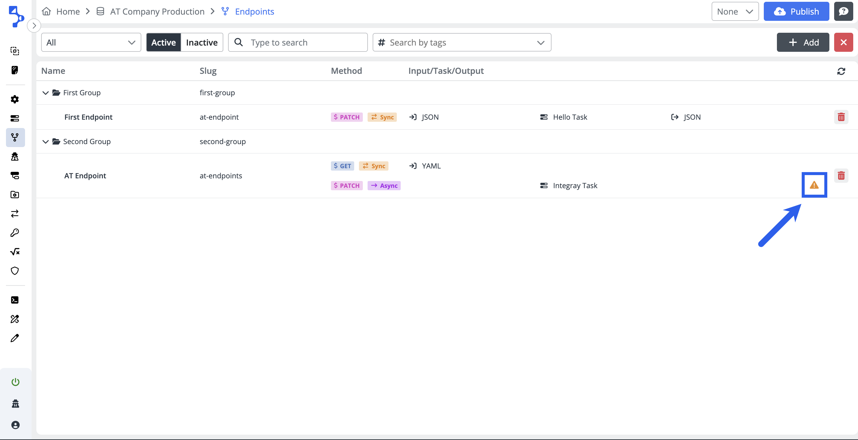 Within the Endpoint list, an additional icon that may appear on the endpoint record row is a red or orange triangle with an exclamation mark. This icon serves as a notification, indicating that a non-runnable or non-executable task has been selected for the endpoint. Hovering over the icon provides additional information.