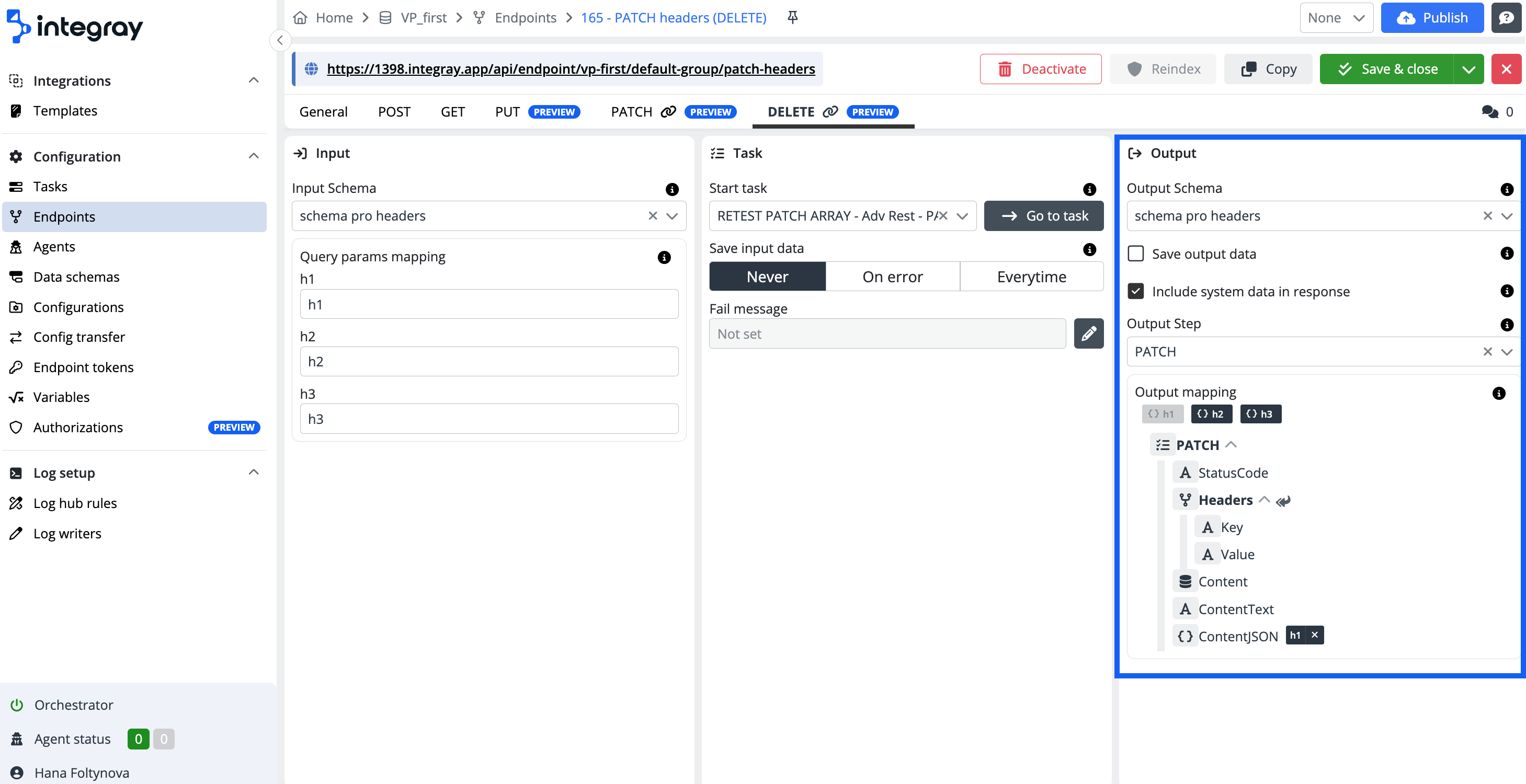 Save output data - If this option is selected, the result of the bound task is not only returned as the response of the endpoint, but also saved to the database.