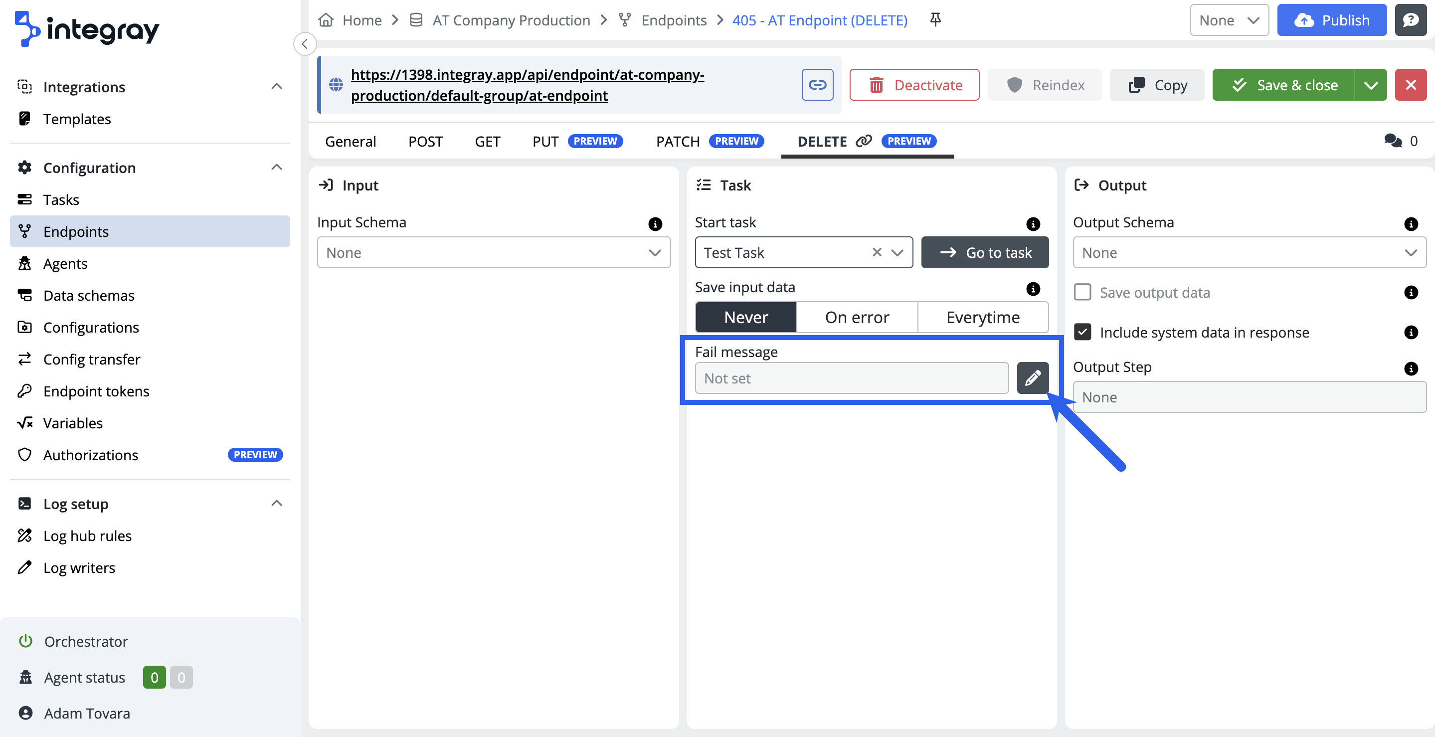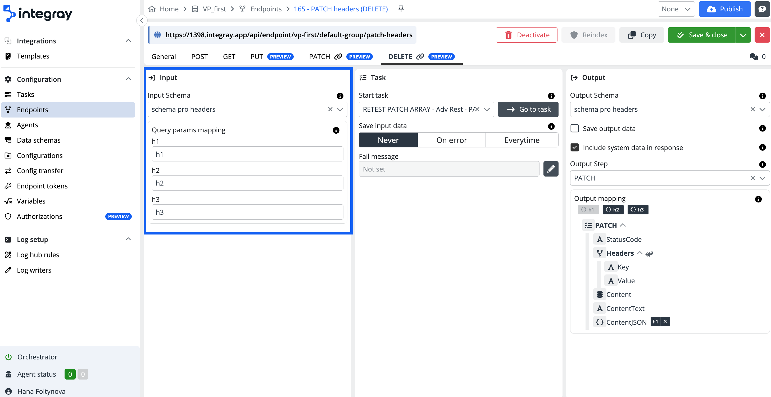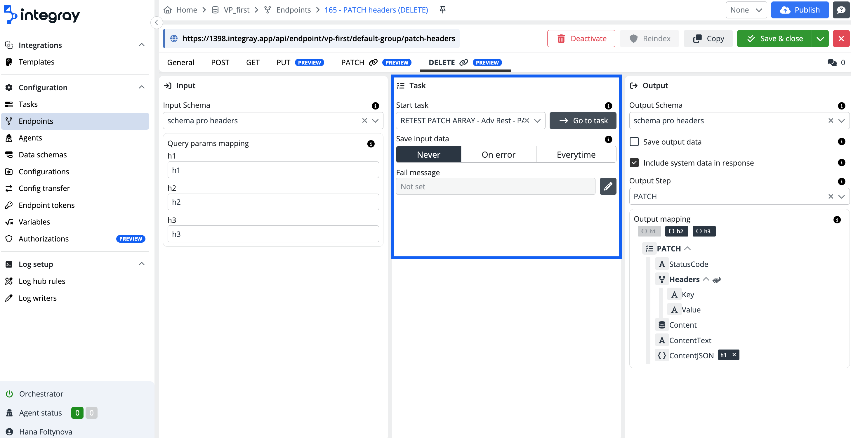 Configure the DELETE method for the created endpoint. The DELETE tab is divided into 3 sections: Input, Task, and Output.
