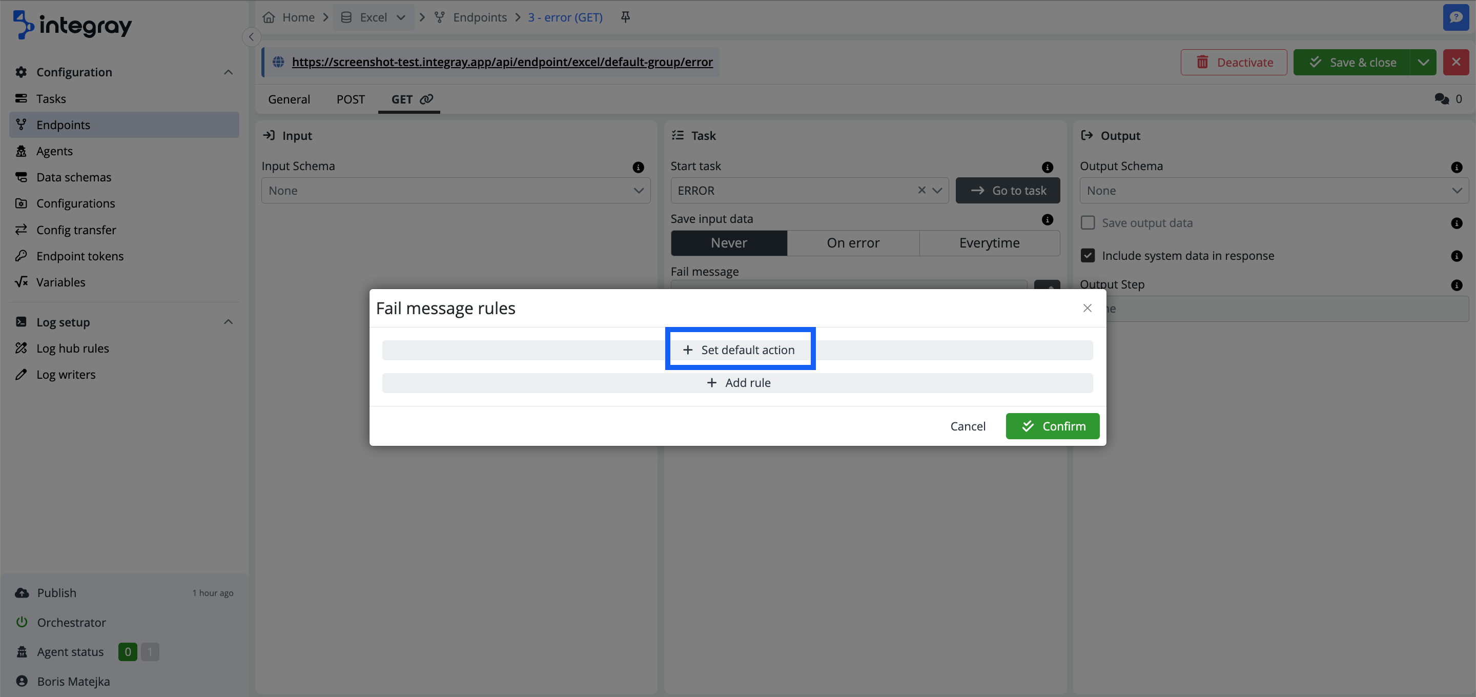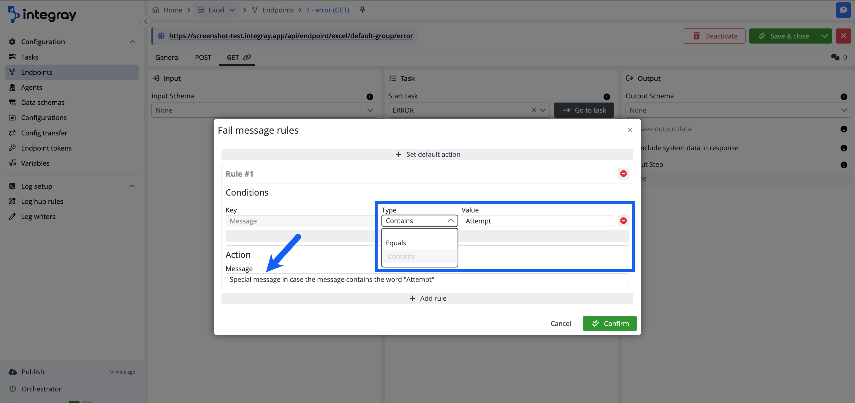 Configure the default action in the Fail message rules dialog by entering your custom message and confirming.