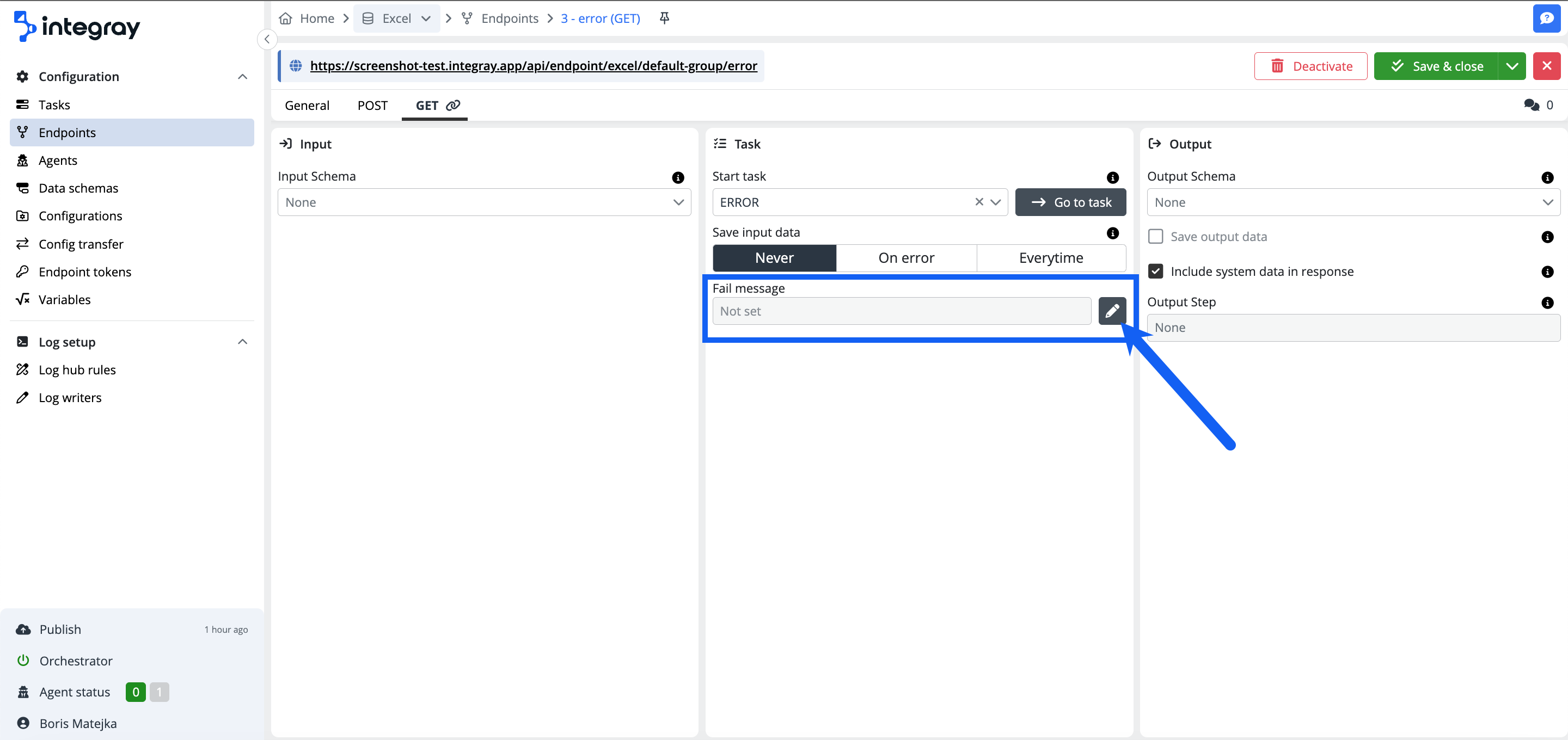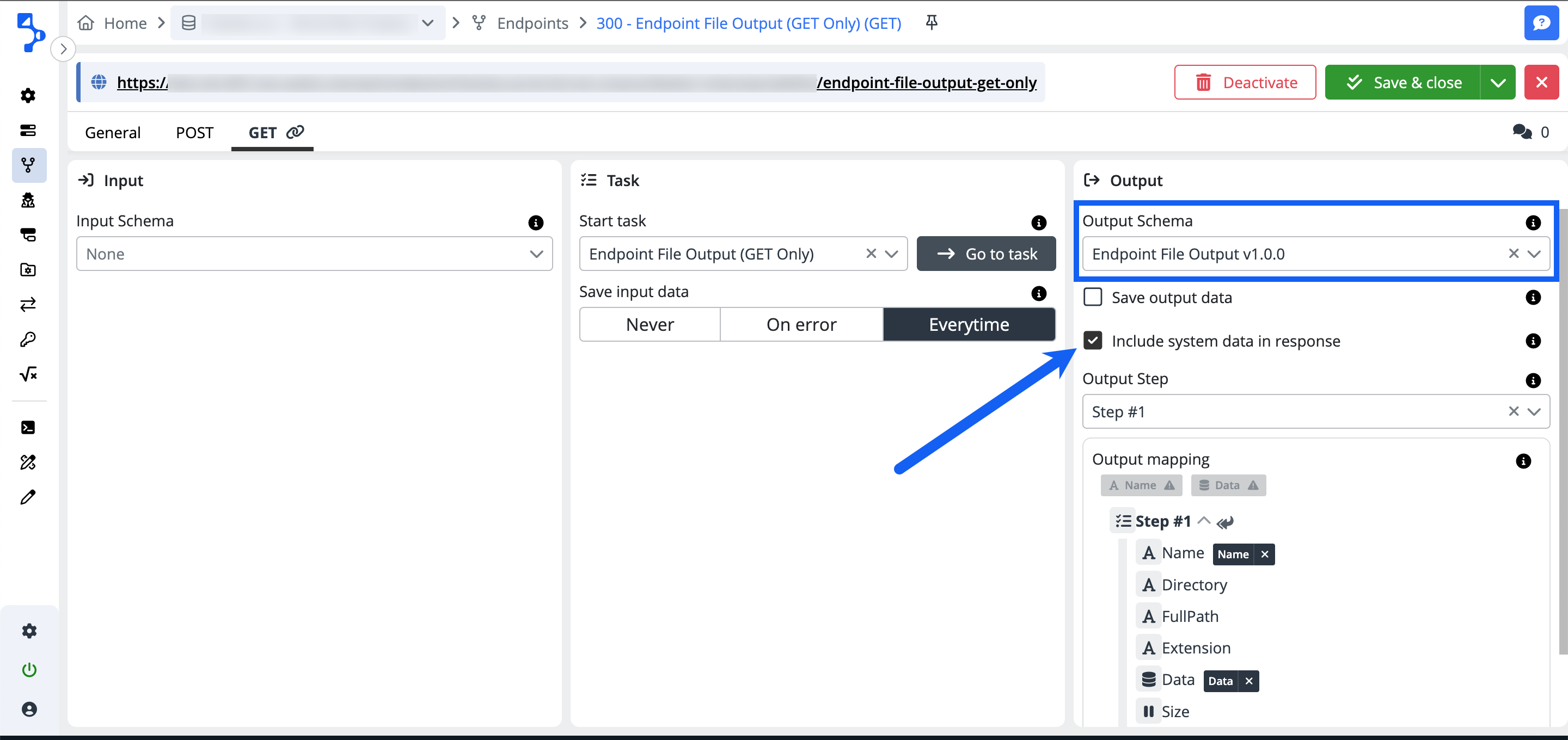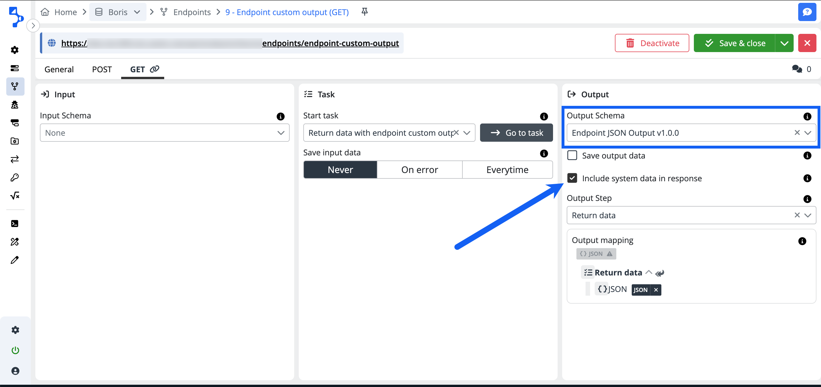 Save output data - If this option is selected, the result of the bound task is not only returned as the response of the endpoint, but also saved to the database.