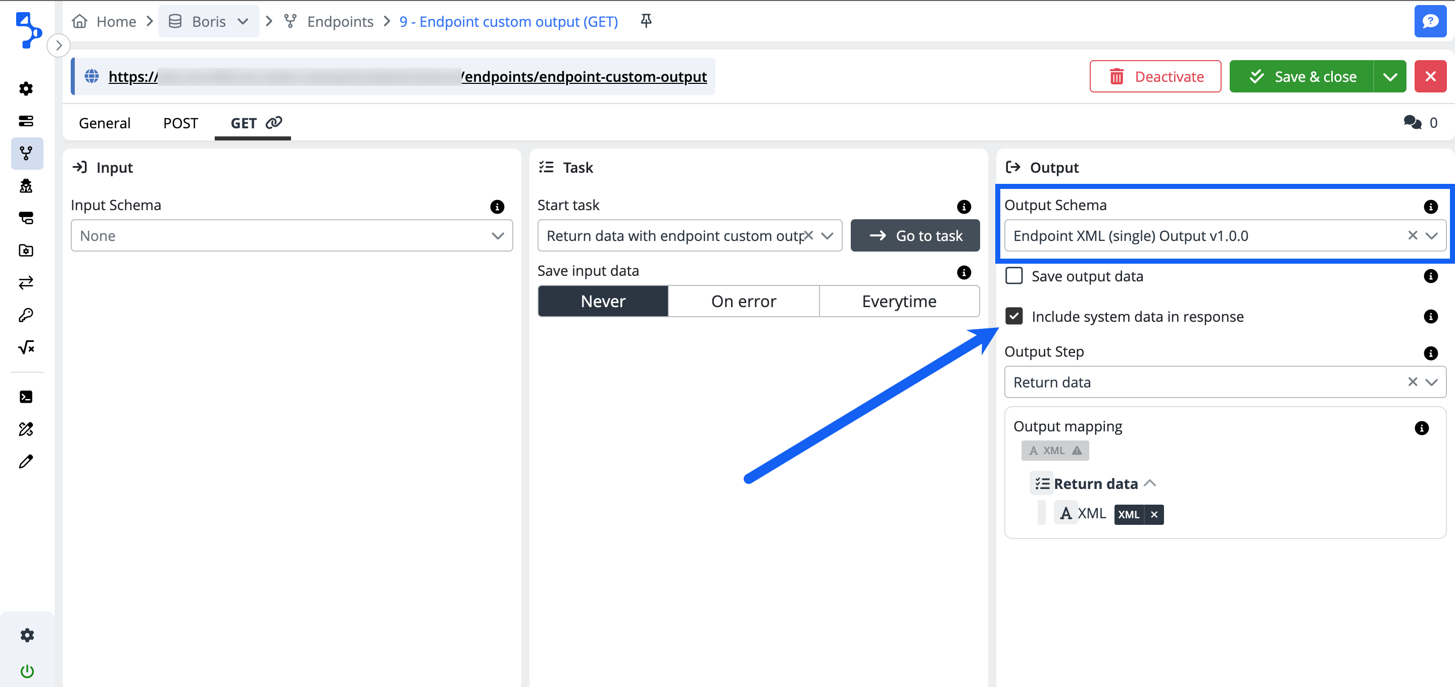 Returns string as XML without any validation - the first member of JSON XML array. The platform configuration requires the selection of the output schema - Endpoint XML (single) Output (version). Dependent on the requirement to include or exclude the system data in response, you will check the respective check box. Works with both HTTP methods GET and POST.