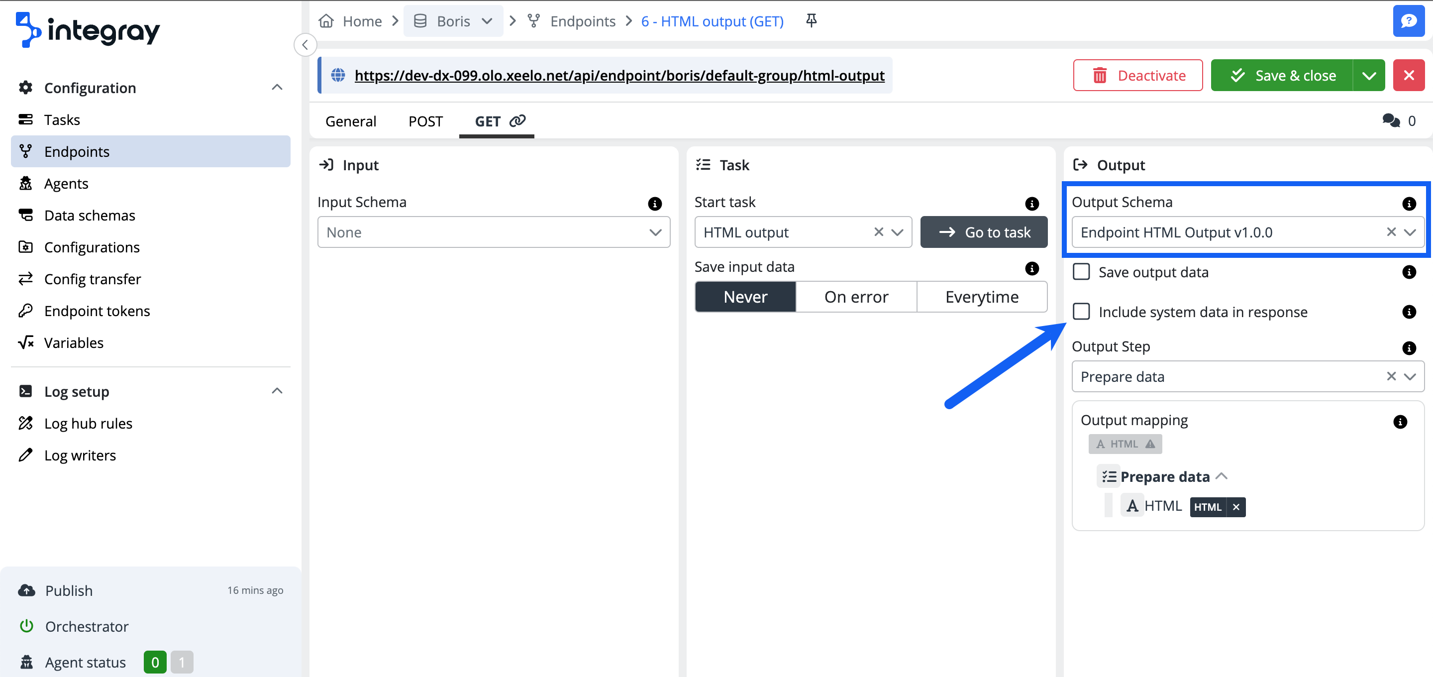 For the moment the last and most recent custom output type is the Endpoint HTML output. This output schema allows to return HTML content. This HTML content won't be validated on the side of integray platform and will be treated as text inside the data schema.