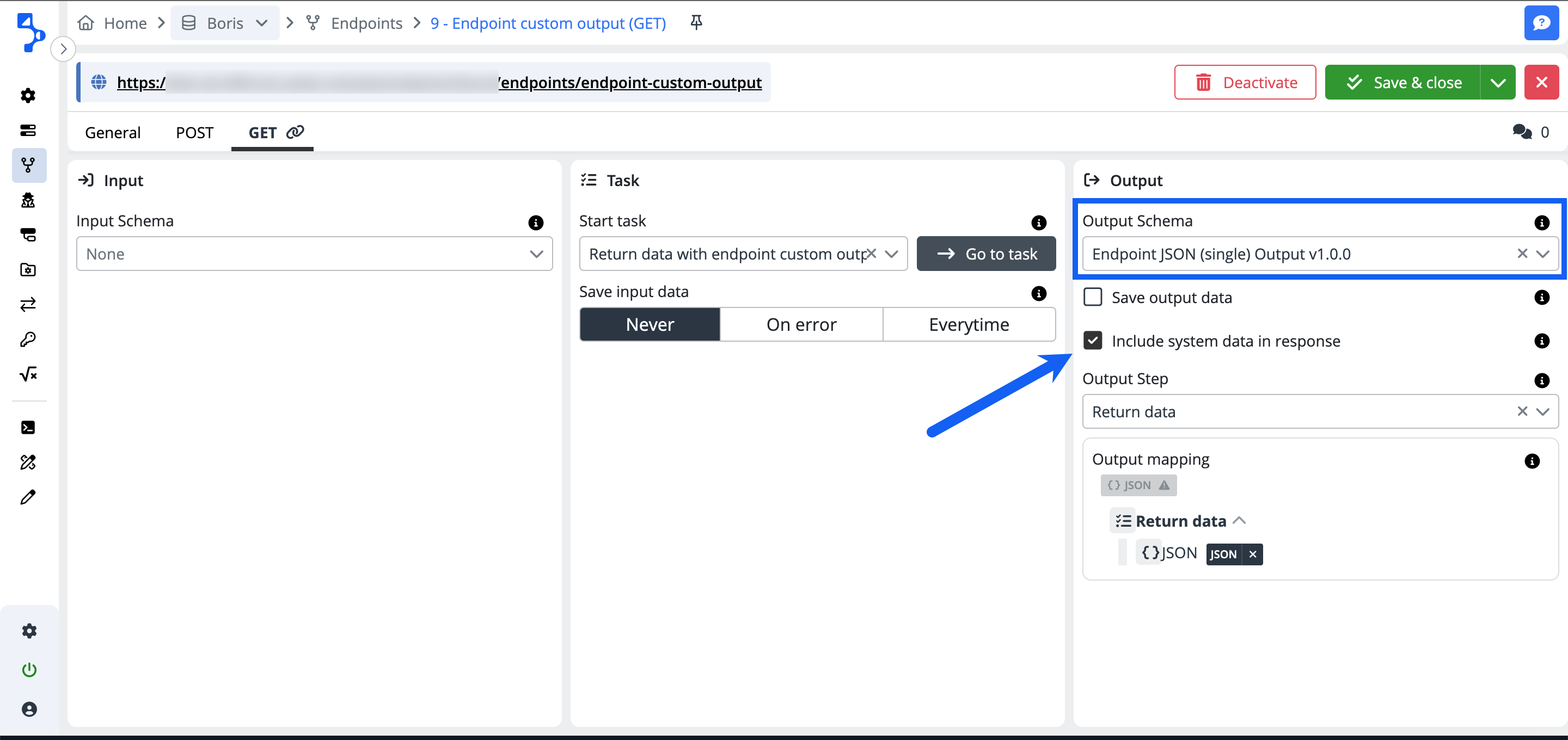 Returns first member of the array without array wrapper. The endpoint result may contain numerous JSON members, but you need to return just the first one of them. Then you select this custom endpoint output type. Note, there is no array wrapper used. The platform configuration requires the selection of the output schema - Endpoint JSON (single) Output (version). Dependent on the requirement to include or exclude the system data in response, you will check the respective check box. Works with both HTTP methods GET and POST.