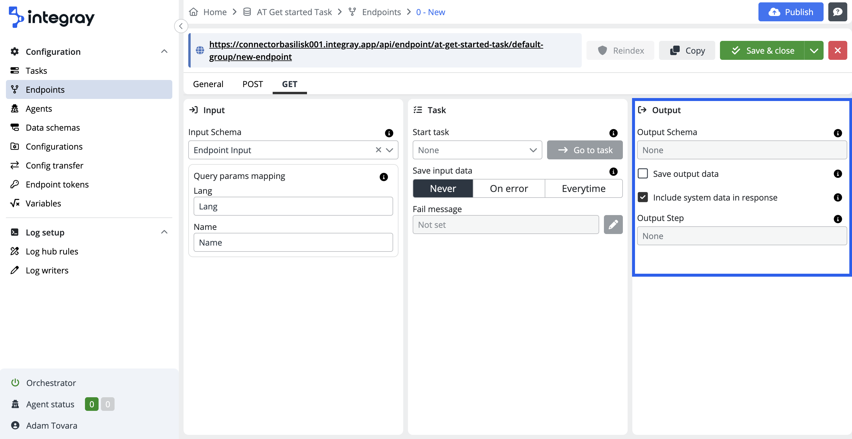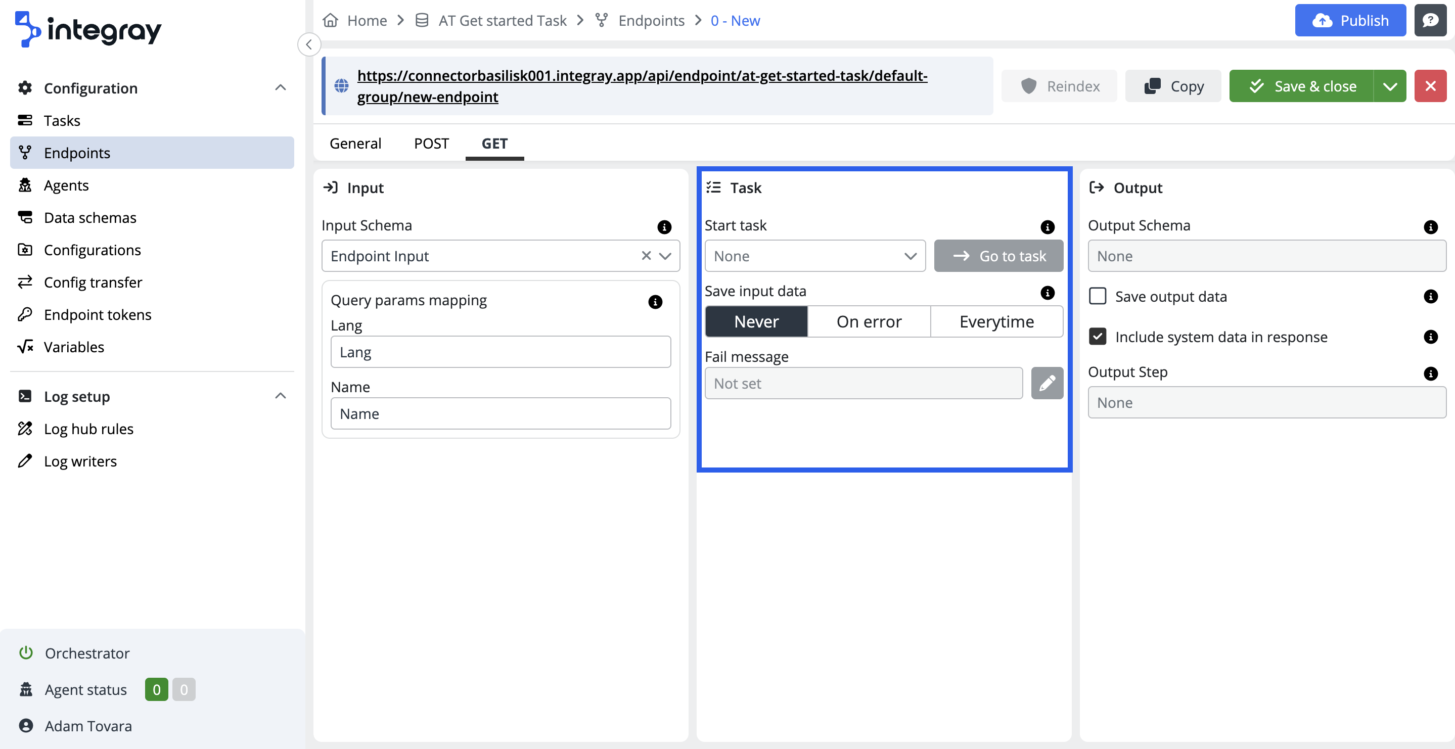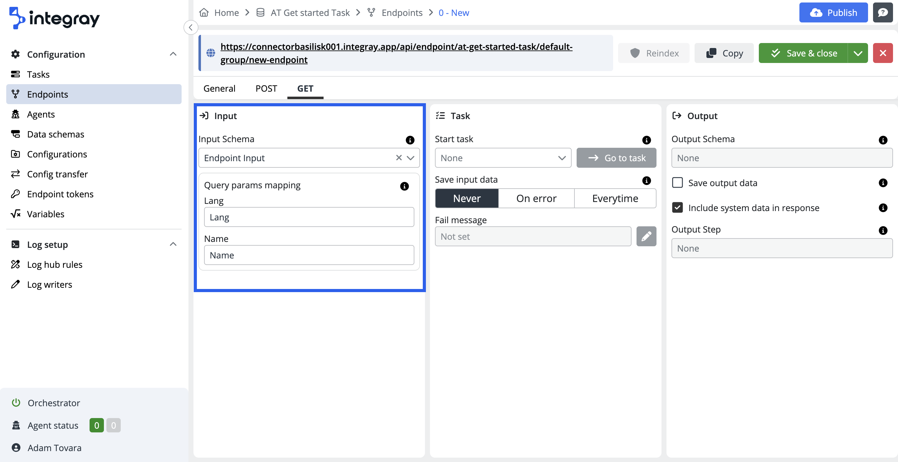 Start task - A task that will be run when a GET request is received at this endpoint. To pass the incoming data to the task for processing, select Input schema and set Query parameters.