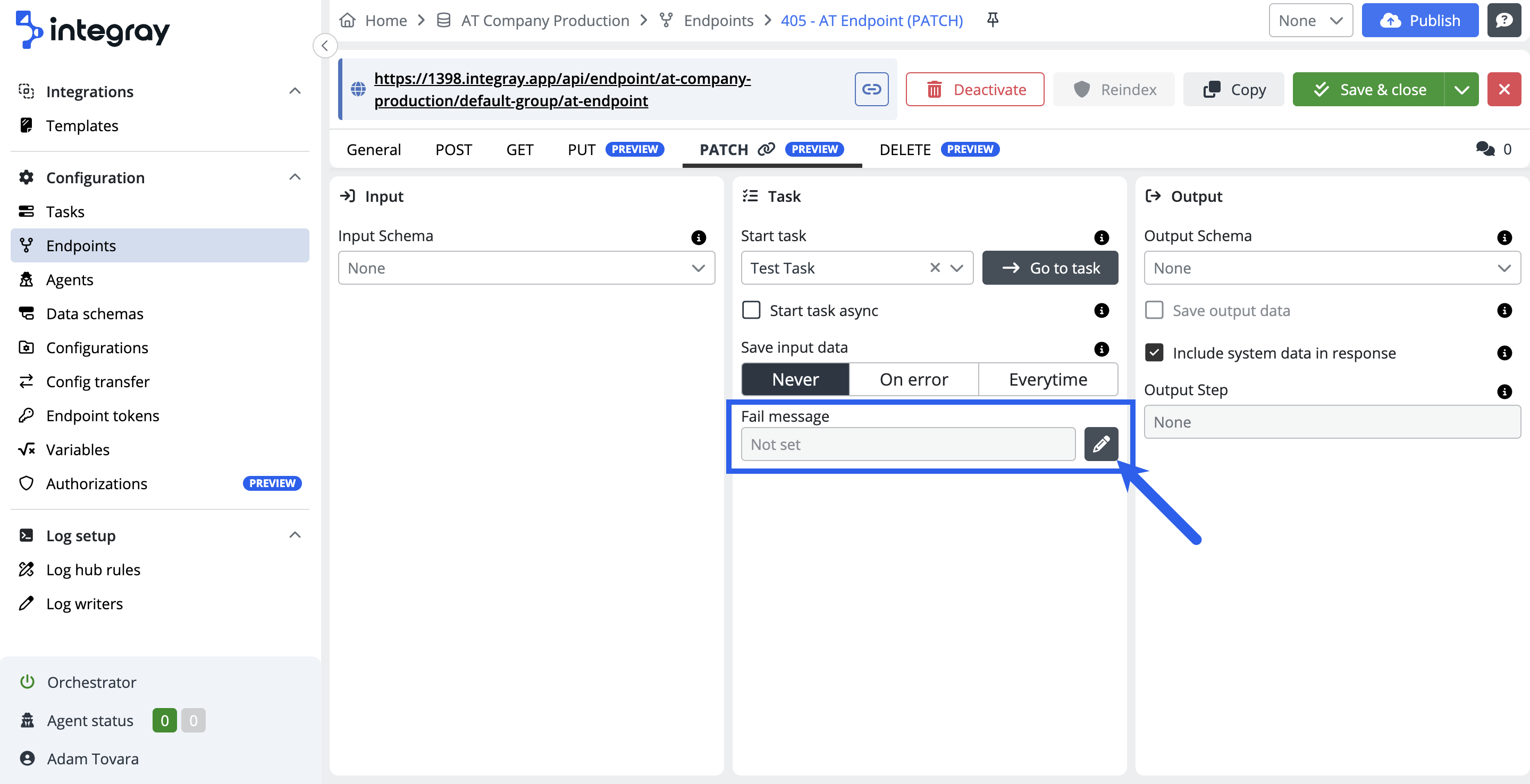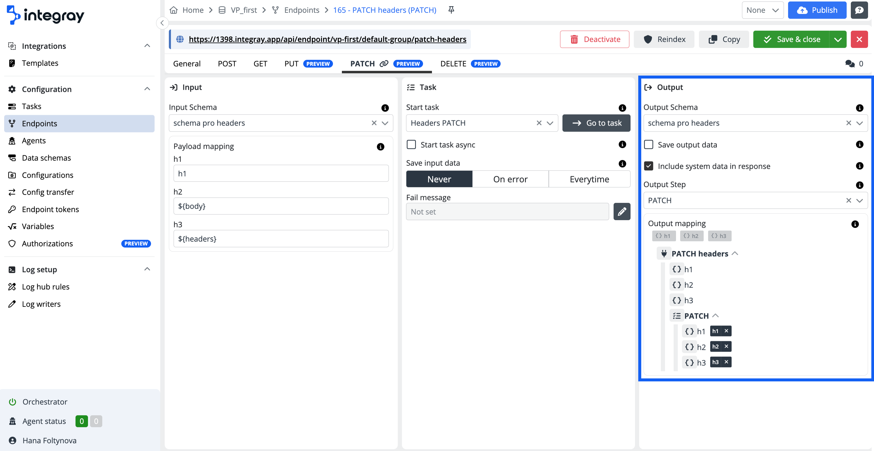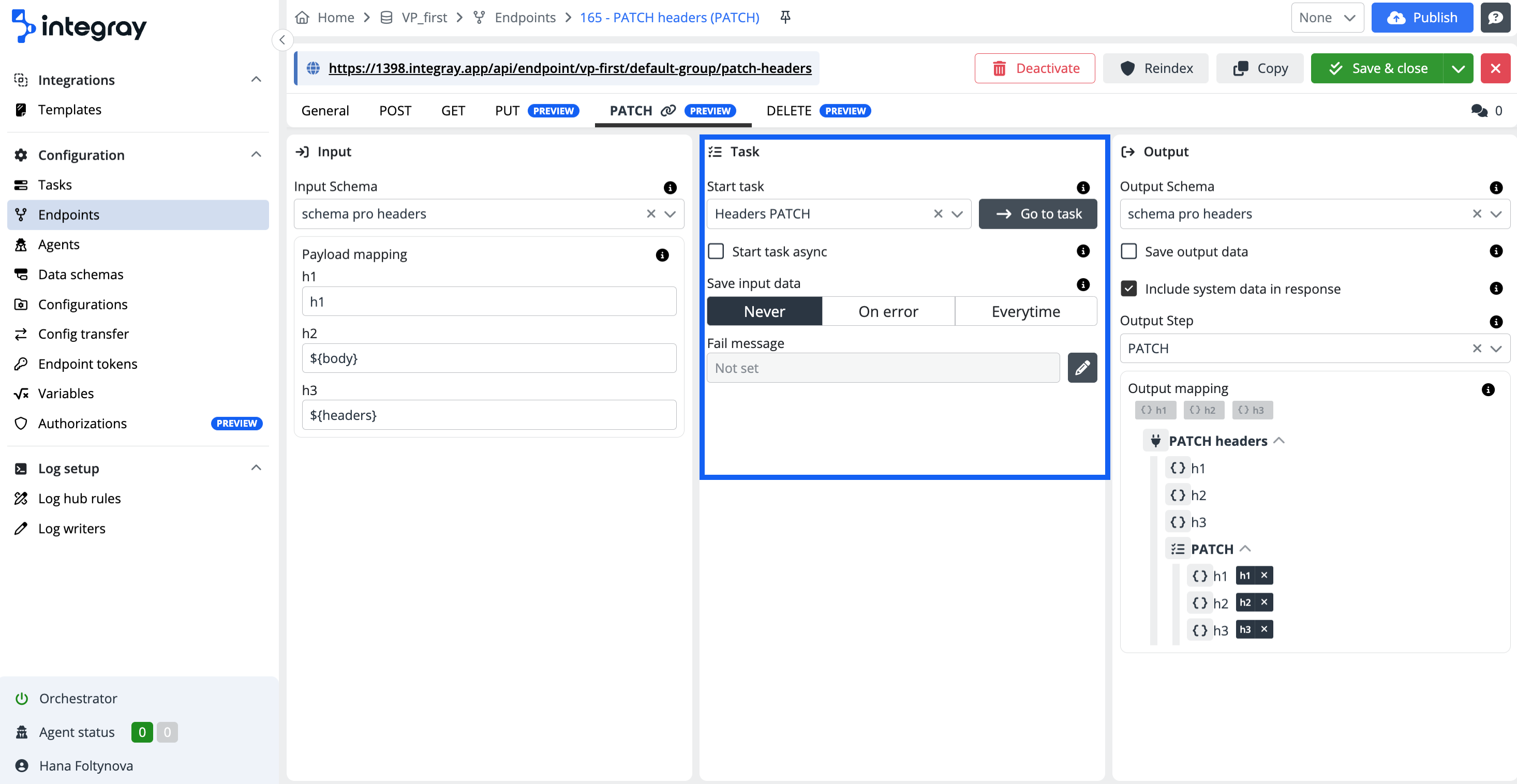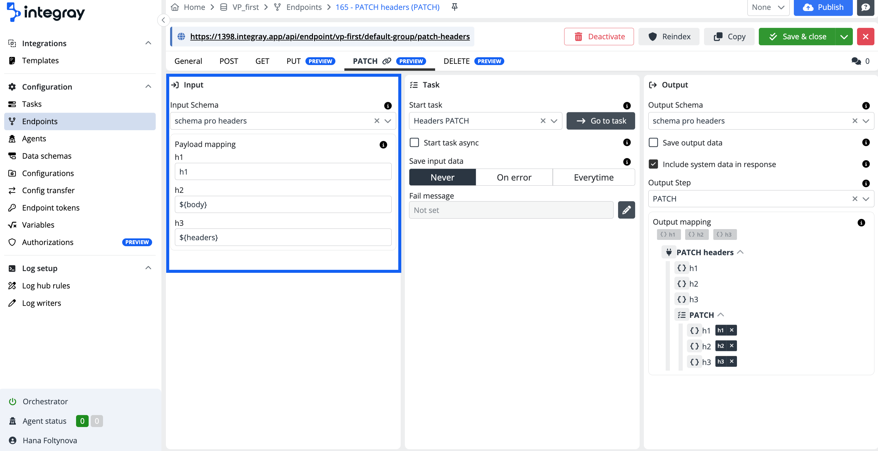 Configure the method PATCH for the created endpoint. The PATCH tab is divided into 3 sections: Input, Task, and Output.
