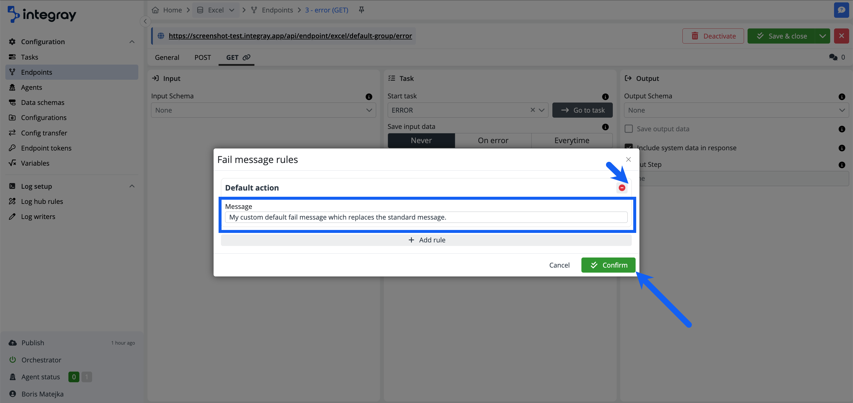 In the expanded Fail message rules modal window, enter your custom message and hit the Confirm button. If you want to remove the message, click the red minus-circle button. You must Save (or Save & close) the entire Endpoints settings to apply the change.