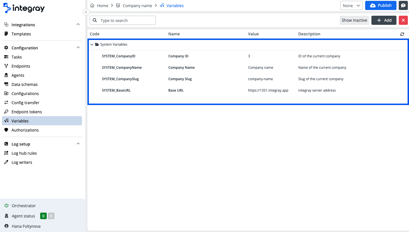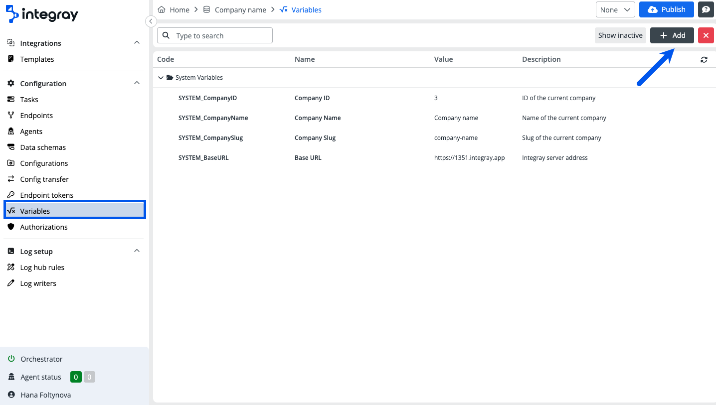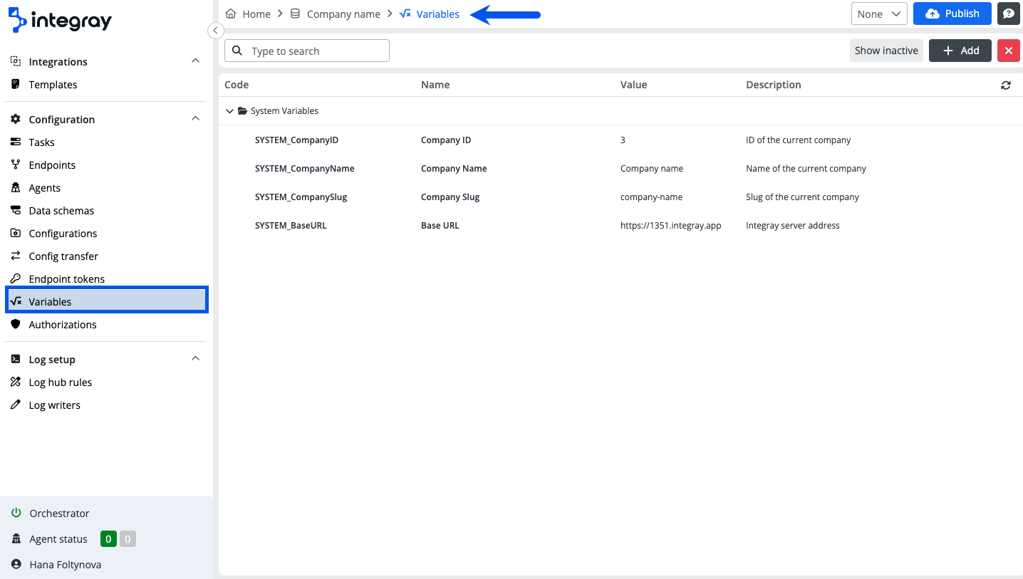 Variables are always set on the company level, therefore to access them, go to the respective Company and select the option Variables in the left content navigation menu.
