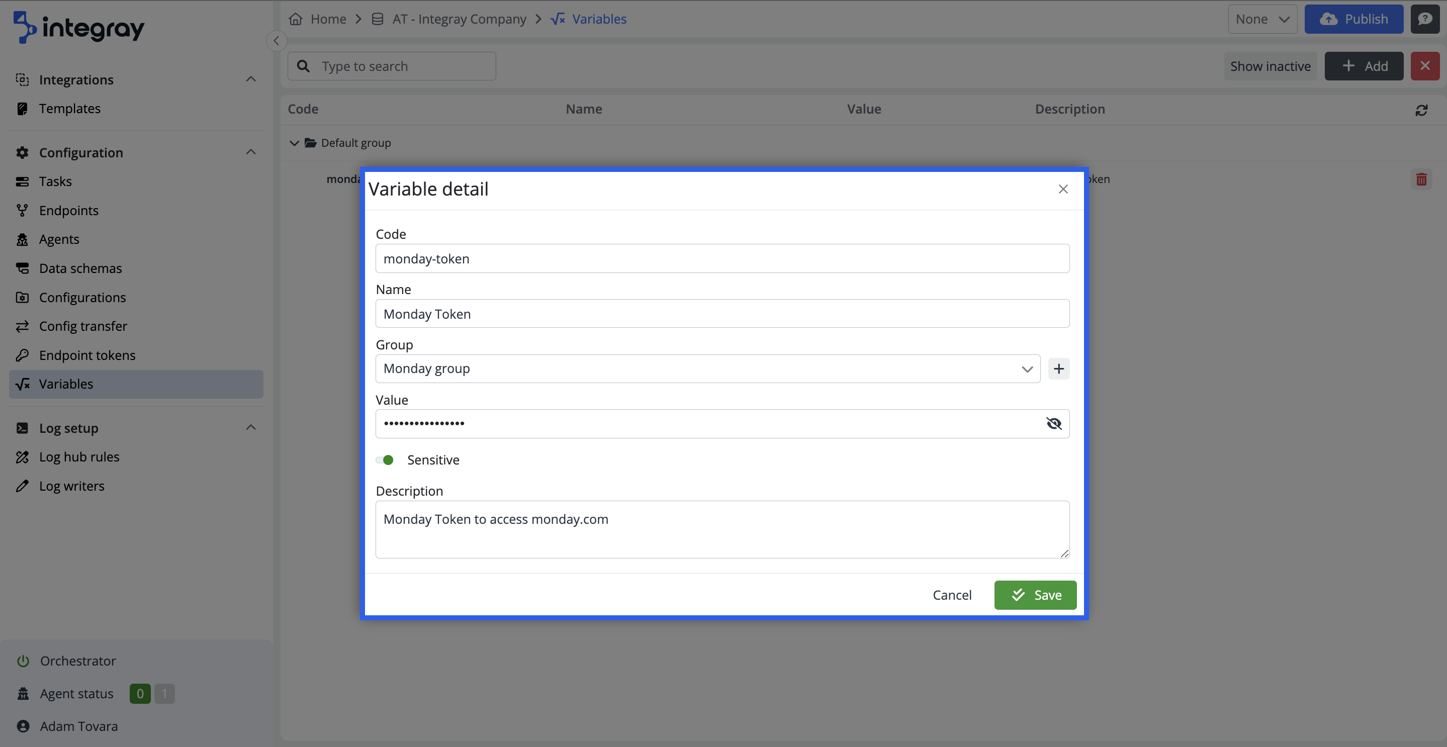 You can turn on the sensitive attribute for any of the set variables. This will result in overlaying the variable value with asterisks to conceal it. Best use for tokens, access credentials, and any other sensitive data used in configurations. The system sets the default value as false (non-sensitive).