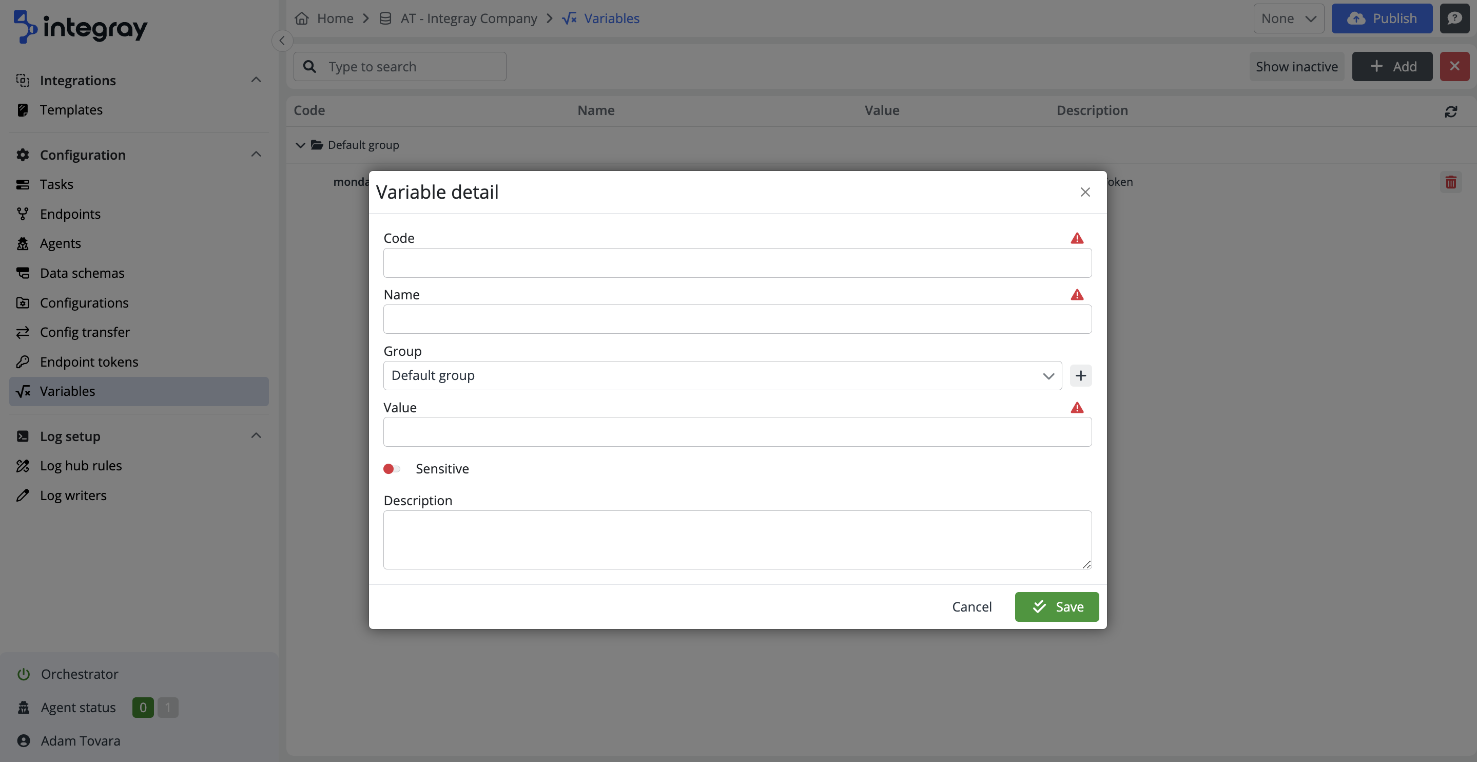 Here, you define the code for your variable, which you will use as input in the platform instead of the specific data value stored in the variable. The code, a mandatory field, allows up to 255 characters. It must consist only of lowercase letters and digits 0-9. Use a hyphen '-' as the sole permitted separator. You can set the Code field only when you're creating a new variable. After saving a new variable, the field becomes immutable. This measure ensures the stability and reliability of variable references throughout your projects and workflows.