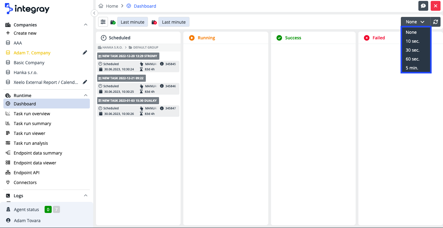 The dashboard can be refreshed automatically with a set refresh frequency of 10 sec, 30 sec, 60 sec, 5 min. In case the frequency is set to "None", data refresh has to be executed manually.
